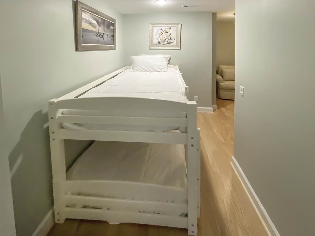 Bonus bunkroom (twin over twin) awaits the children or adults as they will have their own little get away. The room is beach themed and also has a beautiful sun dollar chest of drawers and swivel rocker for some peaceful reading.