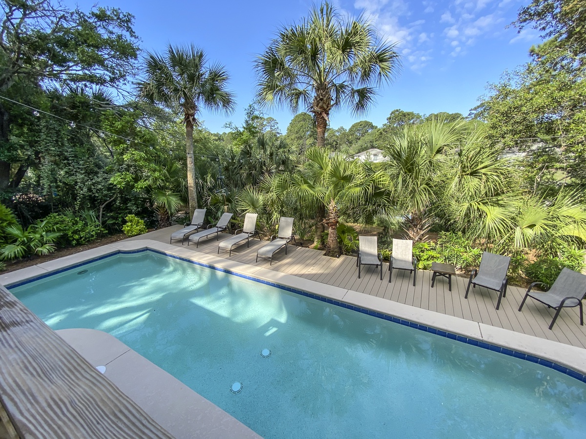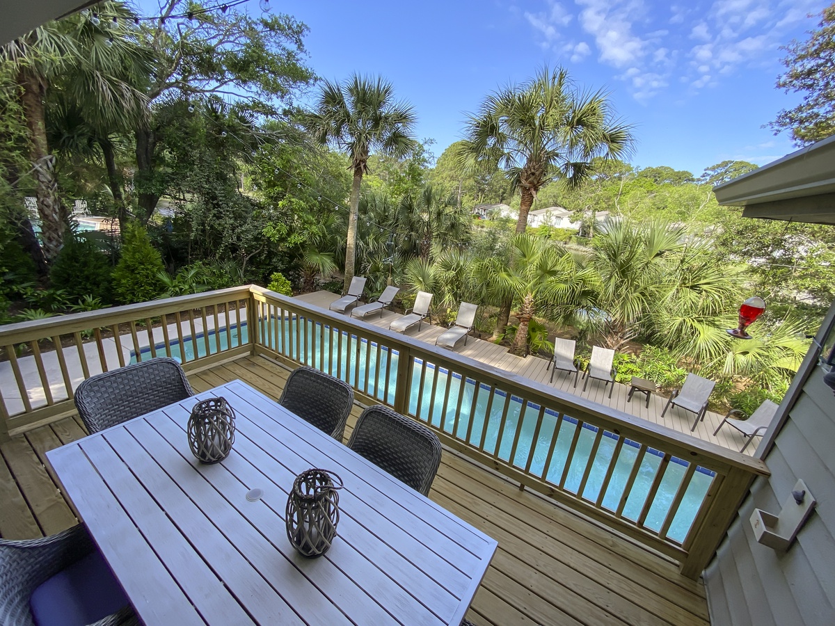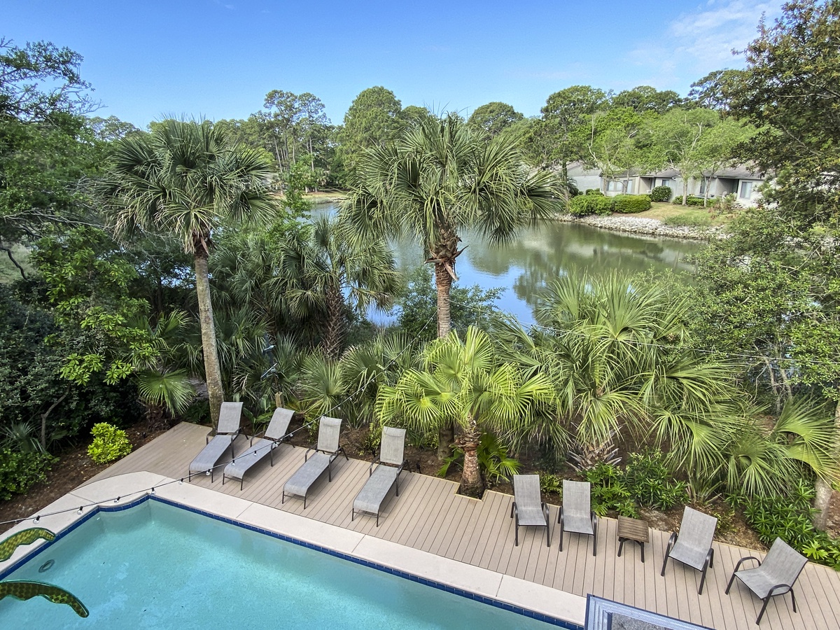 From both the family and living rooms there are large sliding glass doors that open to a new deck with updated outdoor seating for six and dimmable outdoor café lights which create a wonderful evening atmosphere. The deck overlooks the pool and tranquil lagoon, which is always active with birds and marine life. An open stairway leads to the sparkling swimming pool and 900 square feet of beautiful new pool decking below.