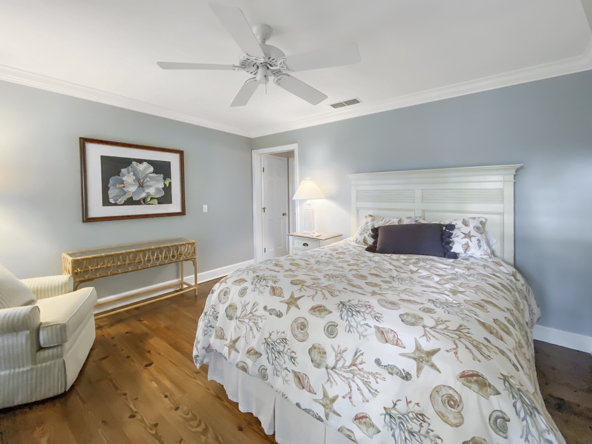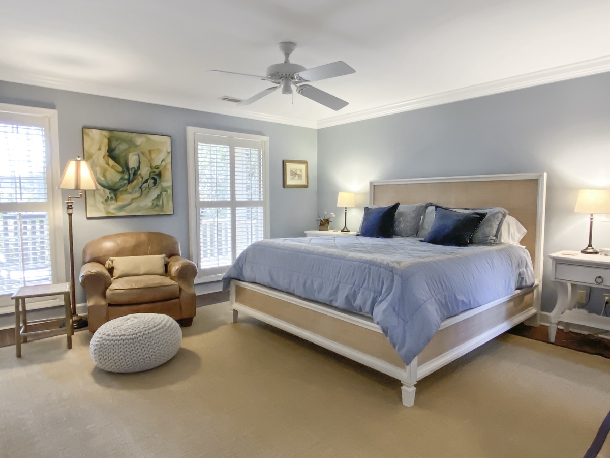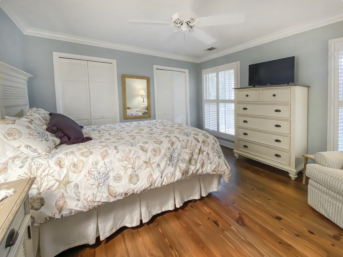 On the first floor, there is a spacious and soothing master bedroom featuring a king size bed with a quiet blue and yellow paisley cover, ceiling fan, and plentiful closet space. The fabulous master bath features custom oyster-hued brick tile, a walk-in shower with dual head and bench, plus double pedestal sinks. The master bath also has a gorgeous view of the pool and lagoon. On the first floor, there is also a guest bedroom in pale sea blue with a king size bed covered in an Atlantic Ocean-themed comforter, plus a ceiling fan, two closets, heart-of-pine flooring and a private bathroom featuring custom tile flooring and a glass door shower. The vanity has a black granite countertop and farmhouse style fixtures.