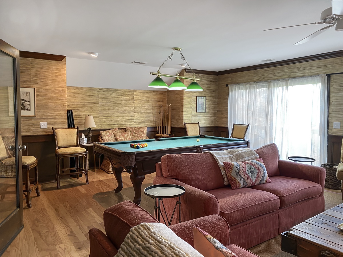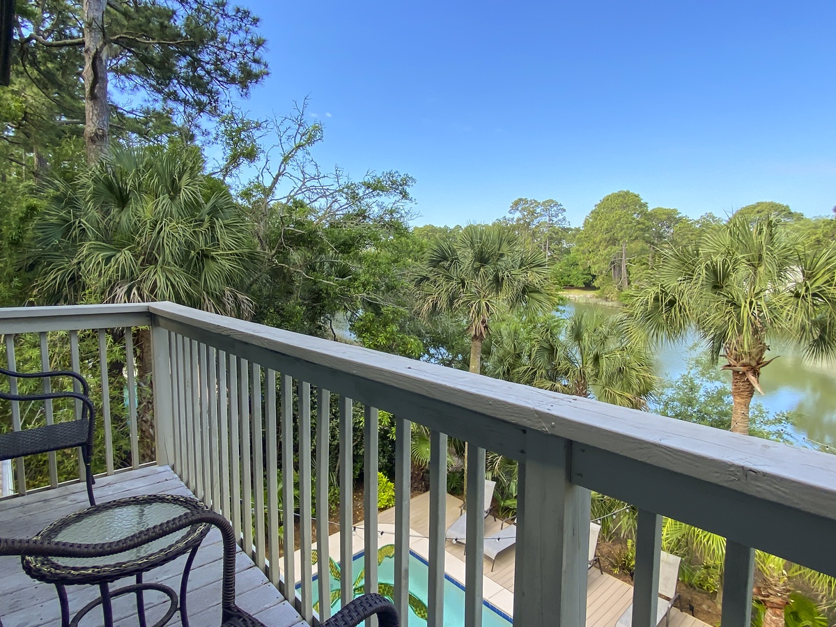 At the top of the staircase is a magnificent game room, which showcases a billiard table complete with traditional pendant green-glass lighting above. With relaxed seating, this cozy wood-paneled room with lovely new grasscloth wall coverings also offers an 85’ flat screen Smart TV, board games, and a mini-fridge. Sliding glass doors open to a balcony with a bird's eye view that spans the tops of palmettos, out to the calm waters of this breathtaking Lowcountry waterscape.