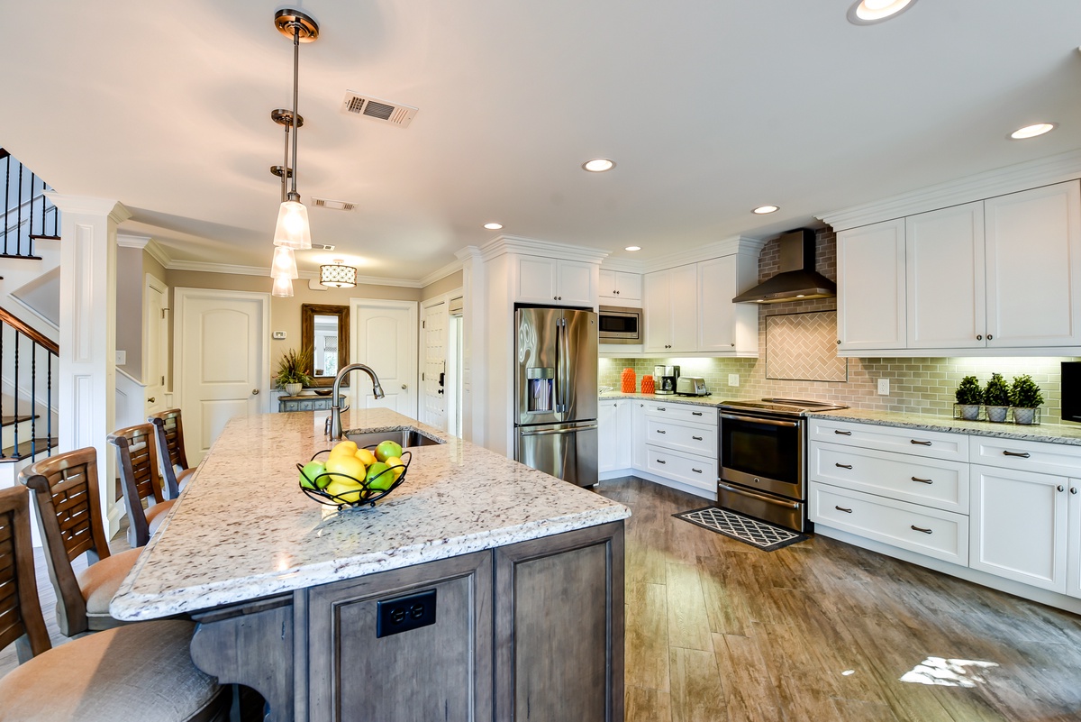 The main living space of this home dazzles with a spacious greeting upon entry, boasting plentiful windows for lush natural light and an open plan that provides room for the whole family. Anchoring this space is the wide speckled granite counter of a center island that marks the expansive kitchen, where stainless steel appliances and ample counterspace provide the perfect hub for entertaining.