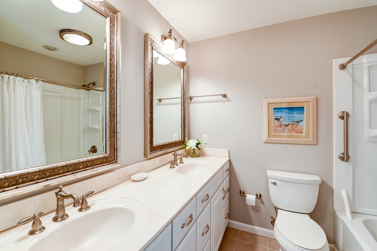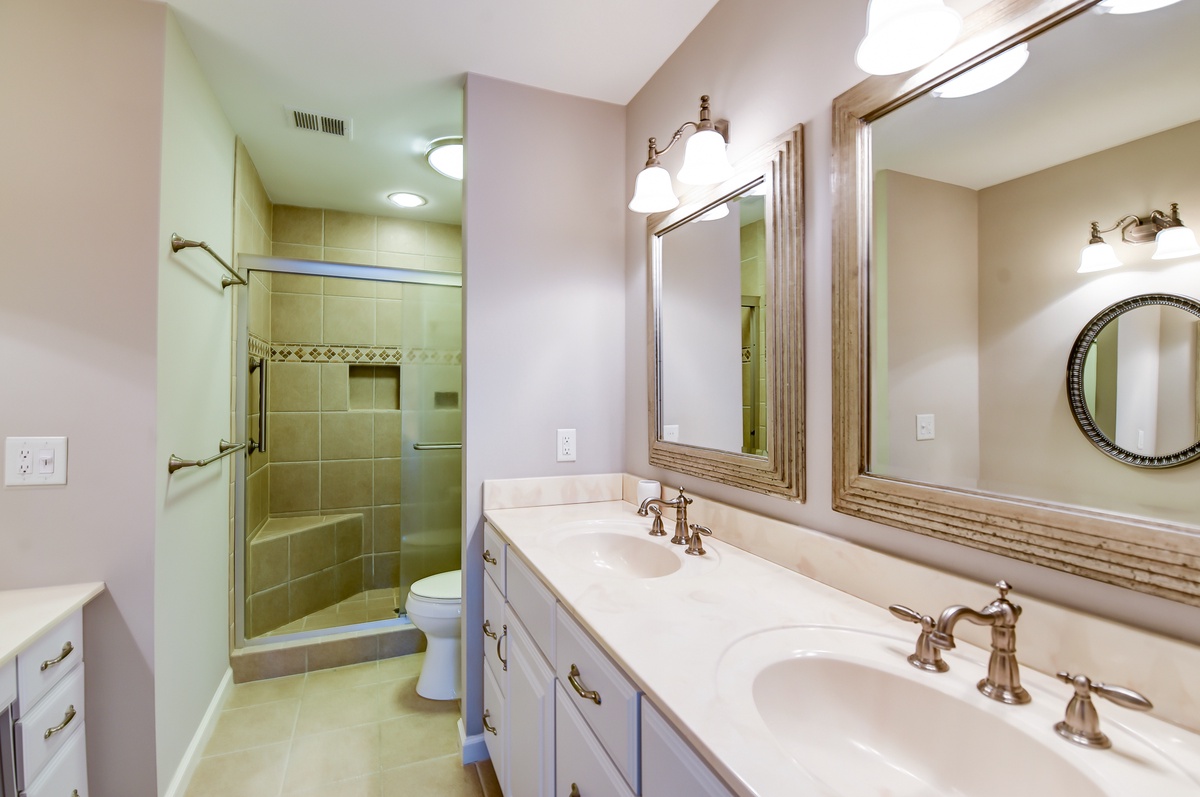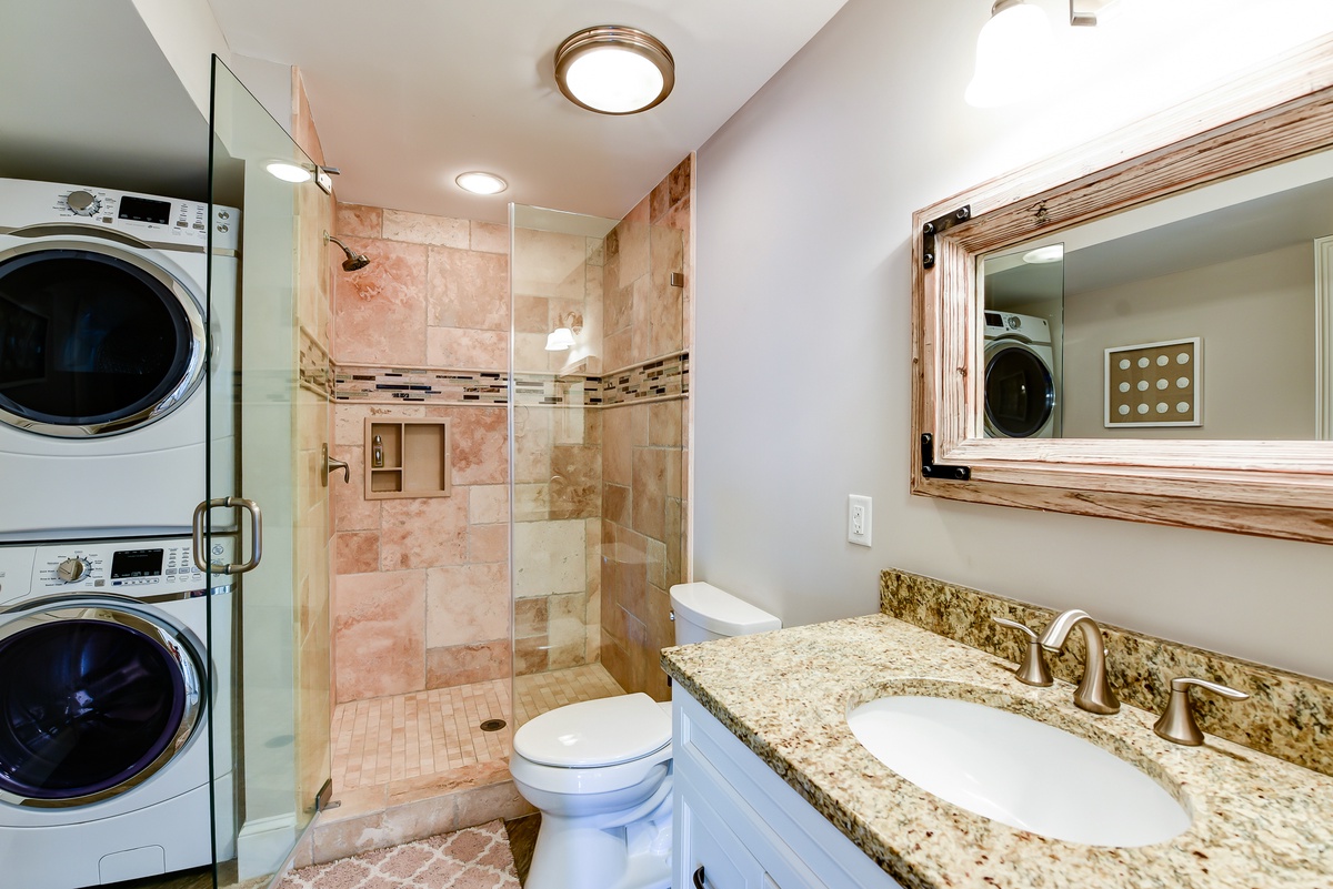 The first of three bedrooms can be found on the ground floor, offering one twin bed & one double in a space with its own private access to a fenced-in patio as well as a personal flat-screen TV and access to a full bath with walk-in shower.