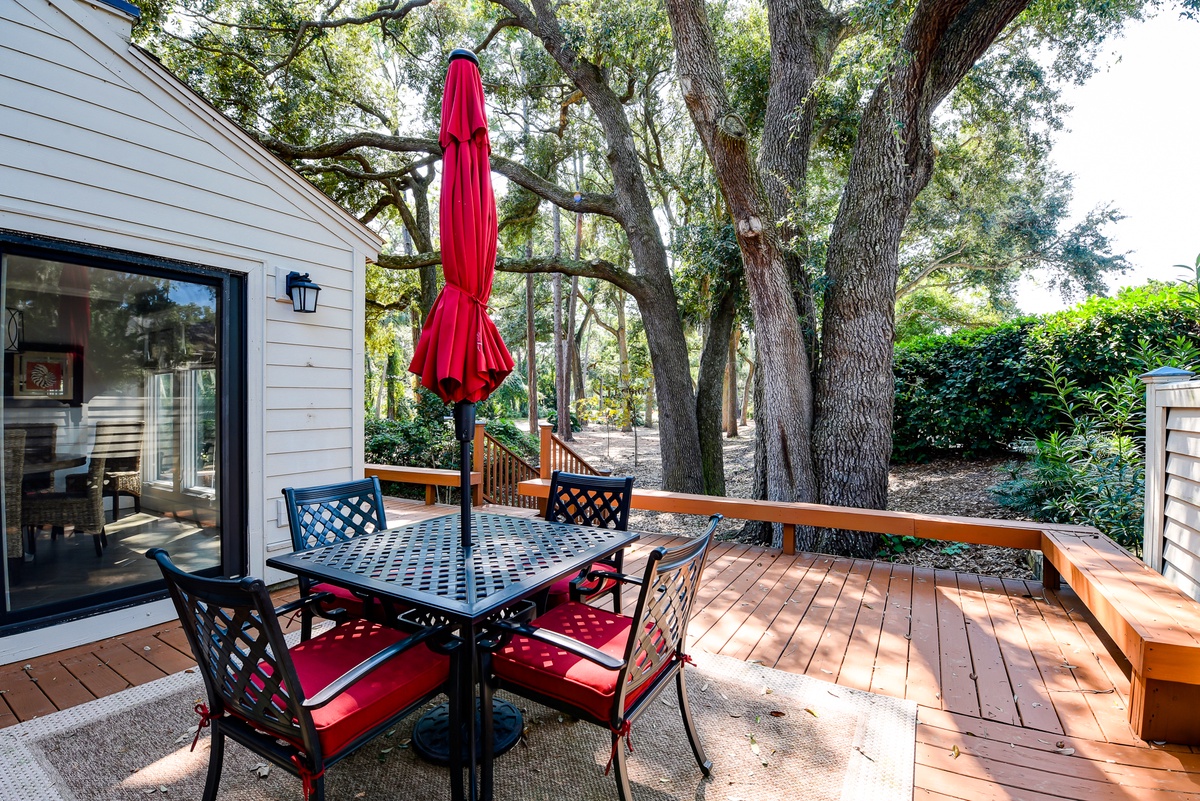 The adjacent dining area provides seating for six in the round amid tall windows boasting lush landscape scenery. Those same windows carry through to the lushly spacious living space, where two armchairs and a sofa rest before a flat-screen TV beneath soaring vaulted ceilings. Sliders in both rooms give way to the marvelous outdoor living space, which boasts built-in bench seating on an expansive wooden patio and al fresco dining for four.