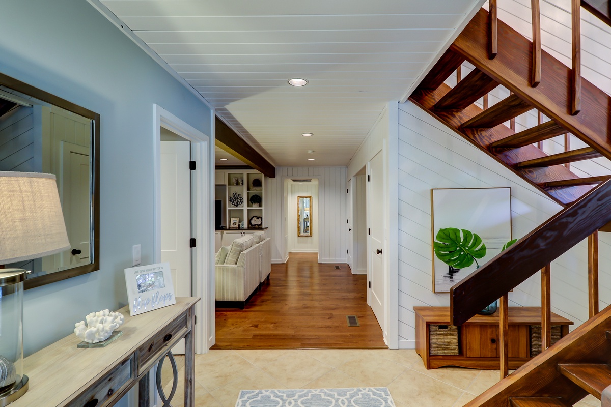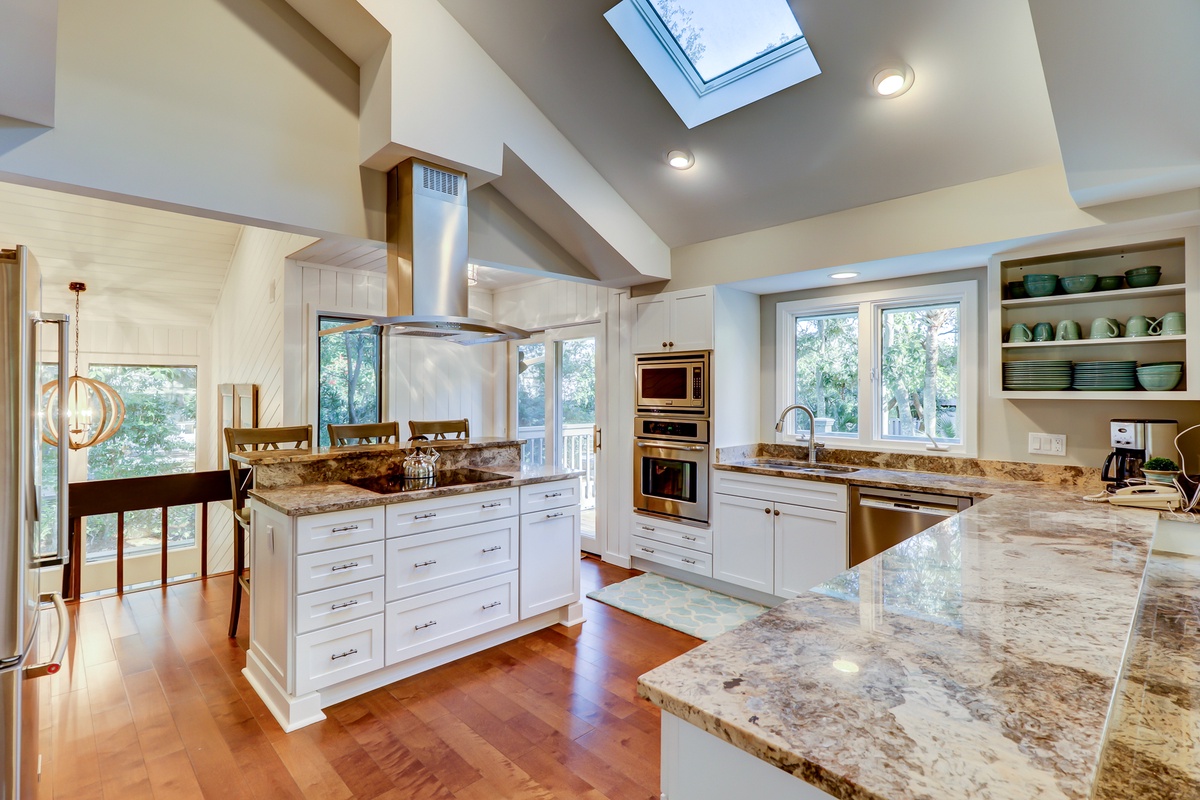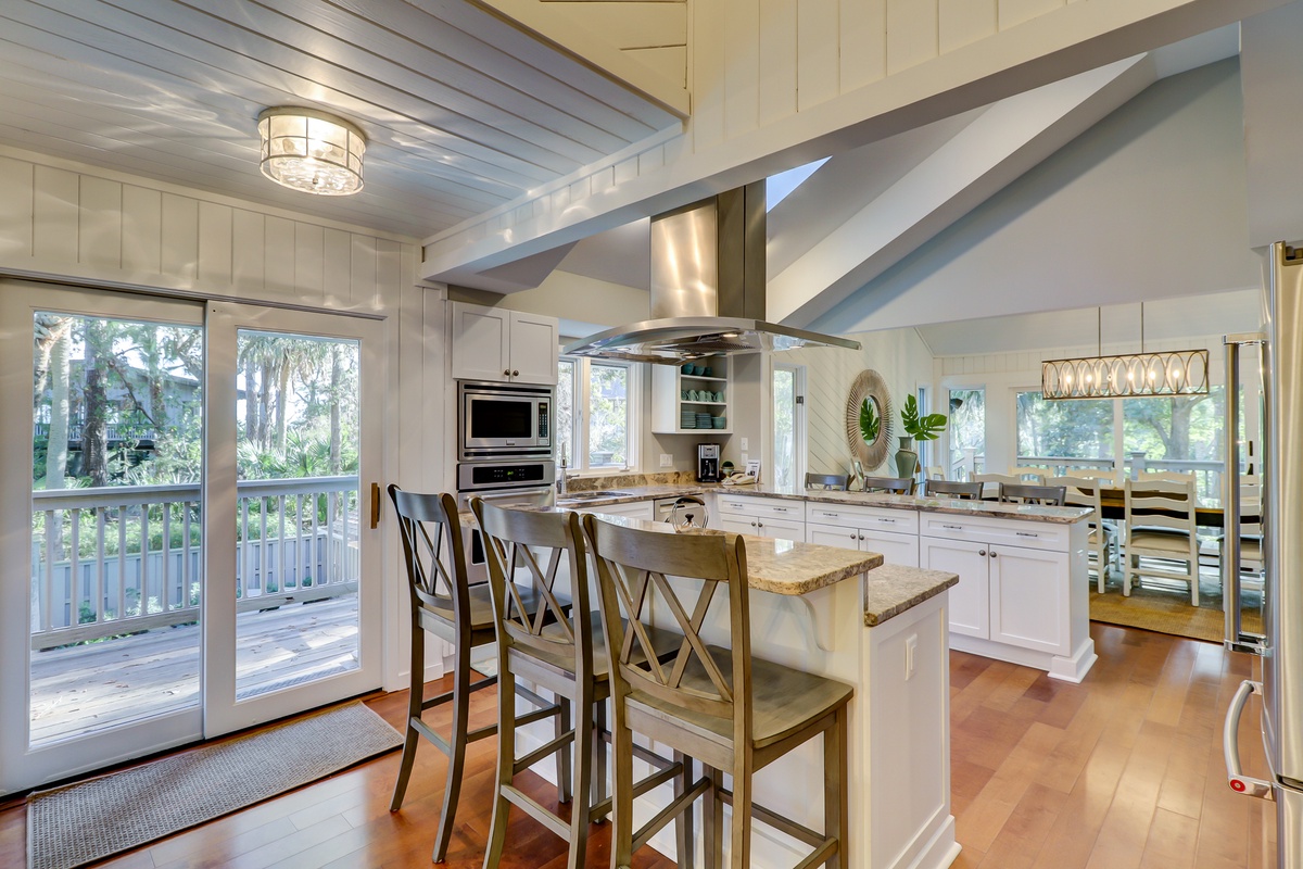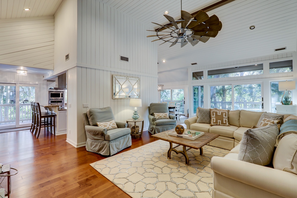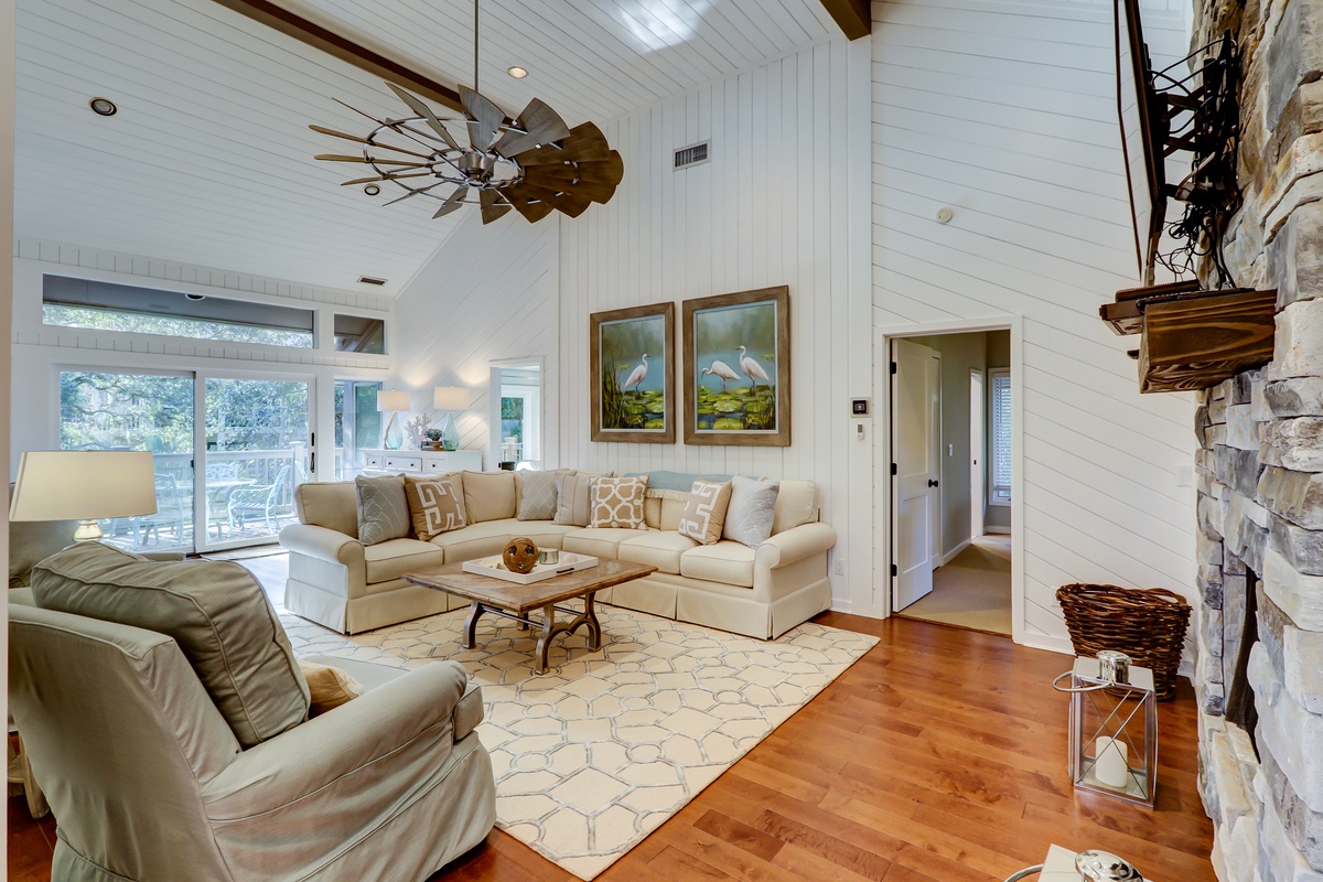 Indoors, the second floor’s soaring great room offers another great place for the family to come together. Angled ceilings of wood paneling evoke the feeling of a cozy beach cabin, which contrasts nicely with the unparalleled feeling of space that runs throughout thanks to soaring windows and natural light everywhere. This lends a sense of grandeur to a living area marked by an opulent ceiling fan, sleeper sofa and loveseat arrayed before a massive flat-screen TV and an accent wall of stacked stone with decorative fireplace.