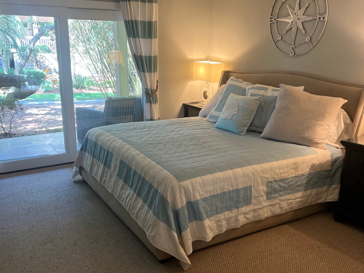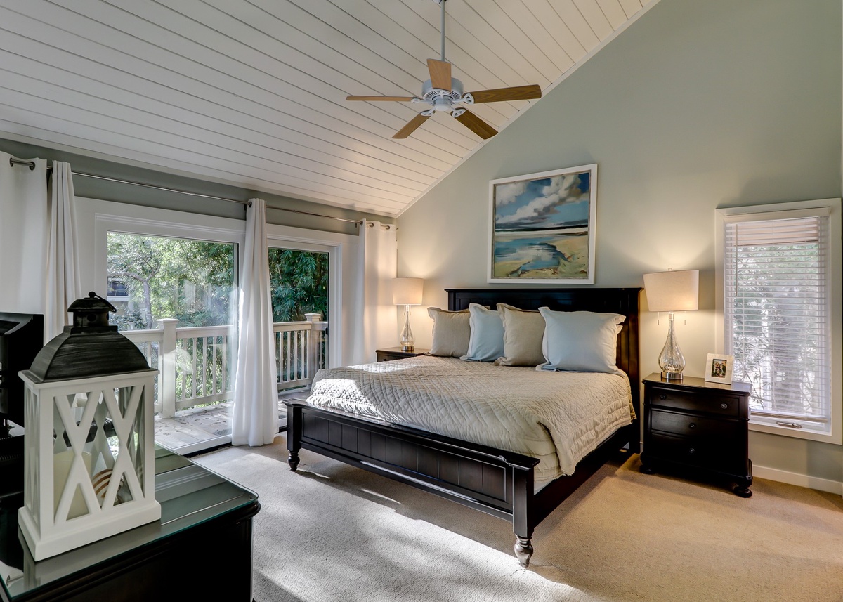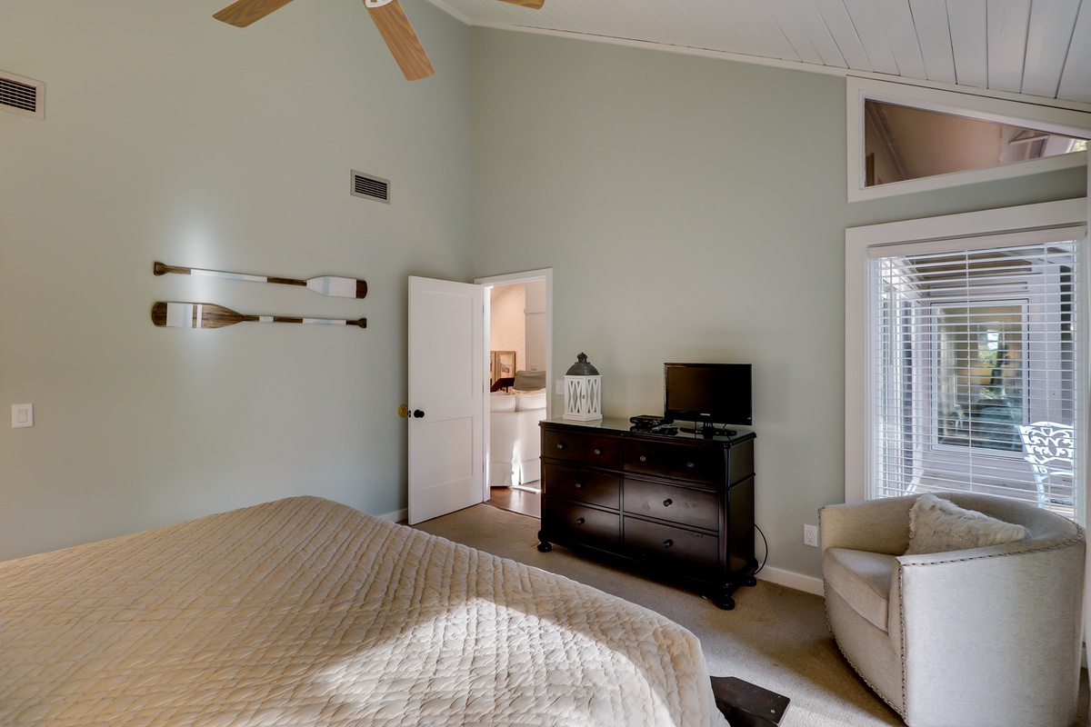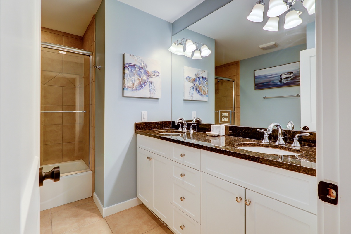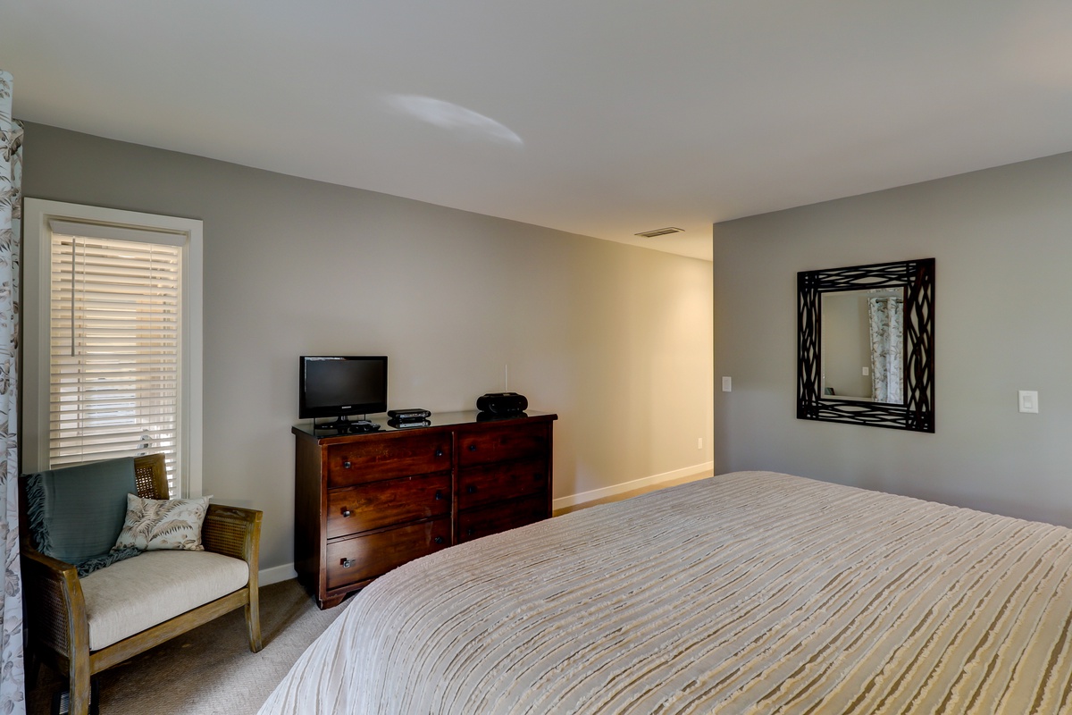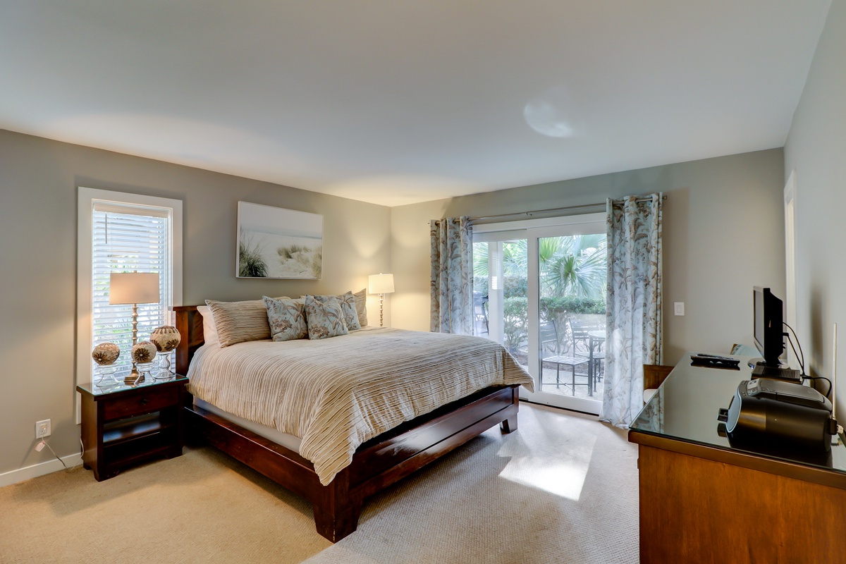 The second bedroom with king bed sits amid Lowcountry chic décor while offering its own flat-screen TV and en suite mirroring the speckled granite dual basin vanity, tub and tiled shower.