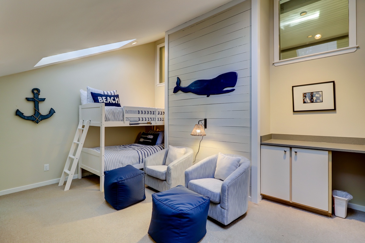 Pass through this room, and you’ll find yourself in the perfect room for younger guests. Here, below angled ceilings and skylights, a tall bunkbed in sturdy oak anchors a room with a wide desk, built-in bookshelves and flat-screen TV.