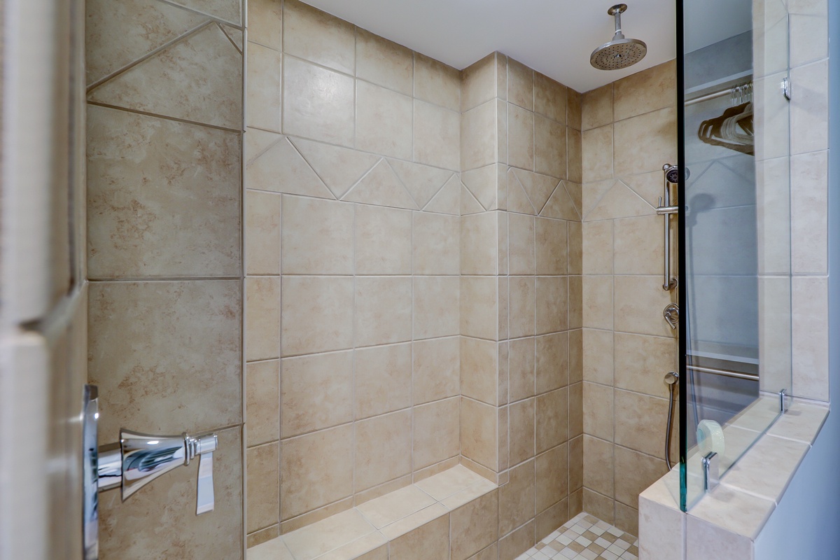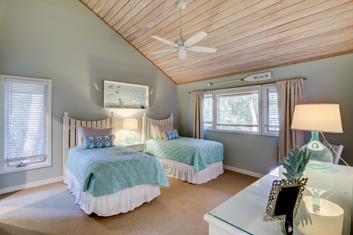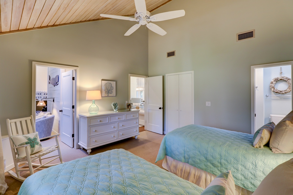 Off the main living space is a room boasting tall wood-paneled ceilings above two twin beds. This spacious suite enjoys a private bath with single basin vanity set in speckled granite, walk-in shower and ample natural light courtesy of a tall skylight.
