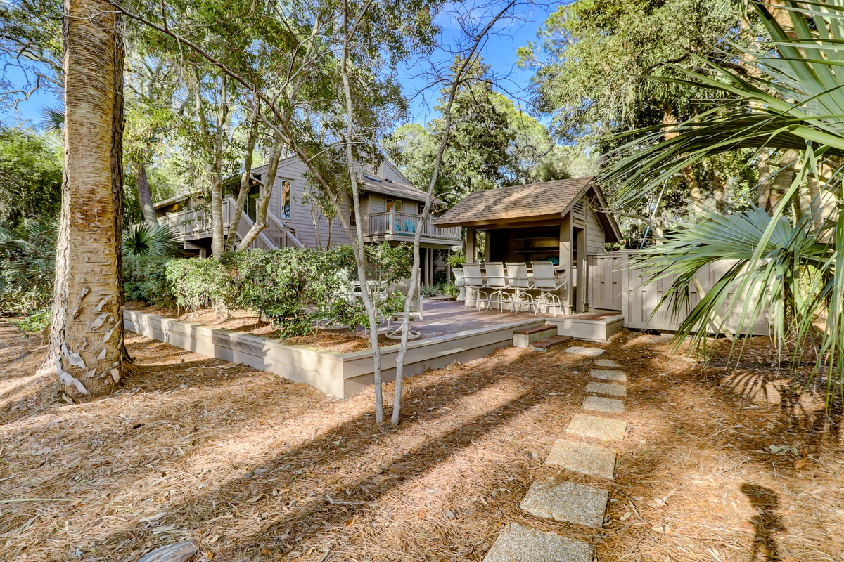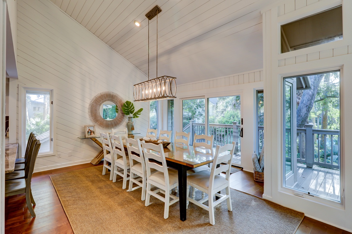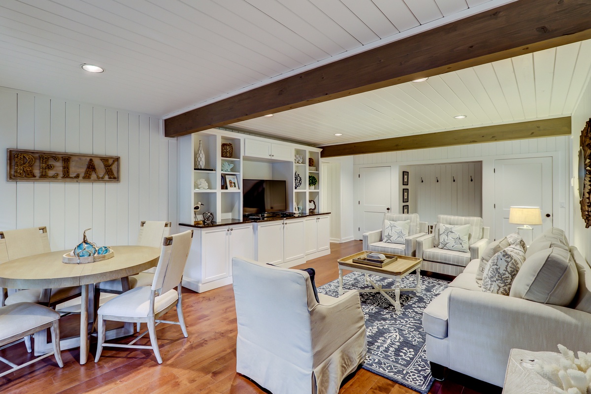 The property’s living spaces dominate the second floor, but even the first floor offers a place to come together in the form of a cozy den set in wood paneling and offering a flat screen TV within built-in bookshelves facing a sleeper sofa and a trio of armchairs. Or, get a game started at the card table with seating for four set next to a wall of windows leading out to a serene pebblestone patio.