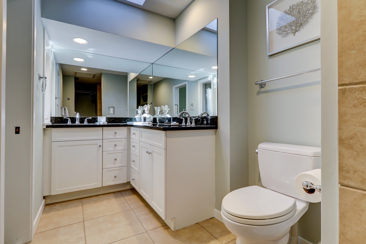Five bedrooms give everyone in the family a place to call their own. On the first floor you’ll find two, each with luxurious private access to the outdoor patio through sliding glass doors. The first offers a king bed in a space enjoying its own flat-screen TV plus an en suite with wide dual basin vanity in speckled granite, tub and shower boasting lovely tiles.