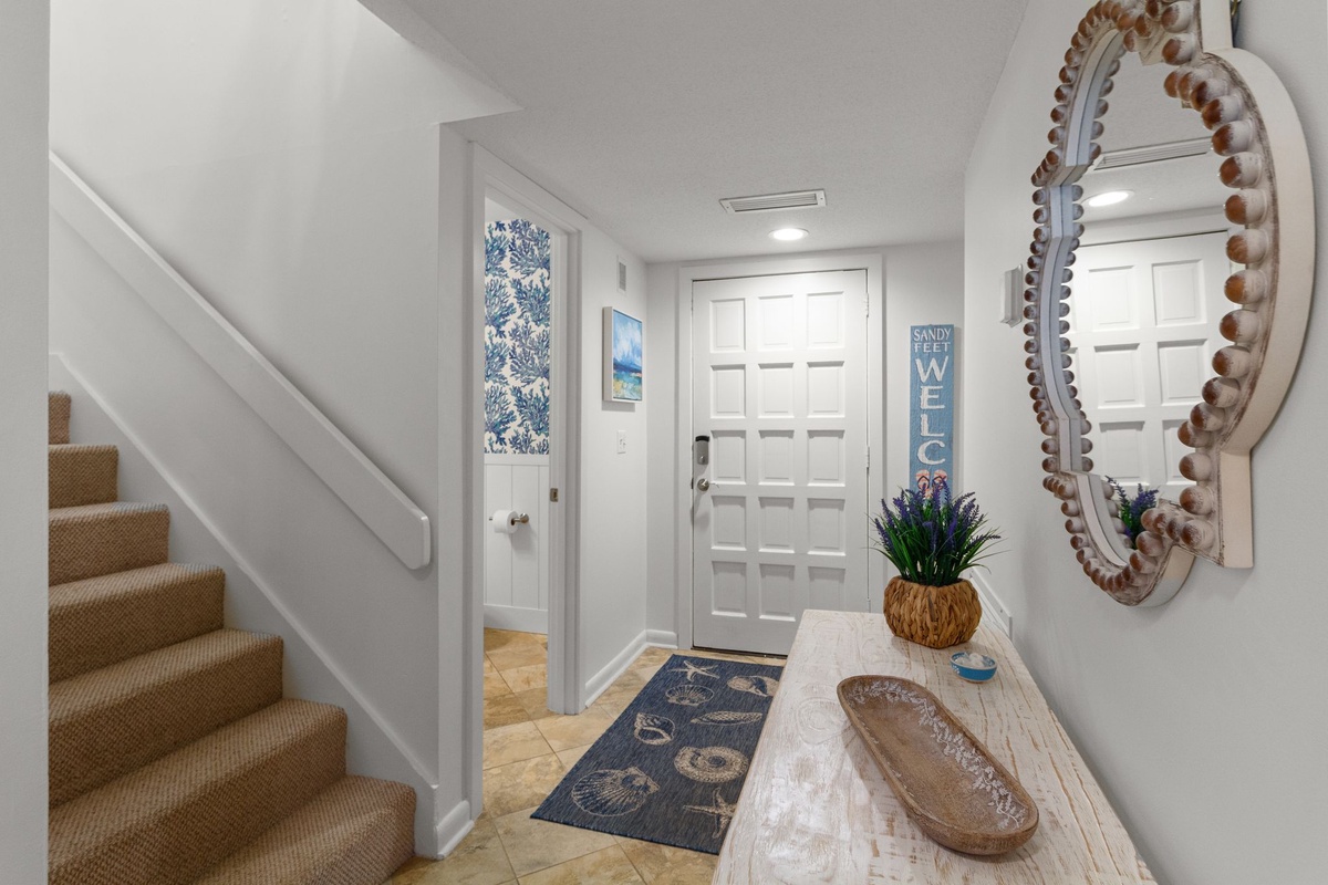 An eye-catching pass-through transitions into the generously sized kitchen, with a full suite of appliances and updated finishes include quartz counter tops. Concealed just beyond, a full washer and dryer offers the convenience of home, with a half bath rounding out the main floor’s amenities.