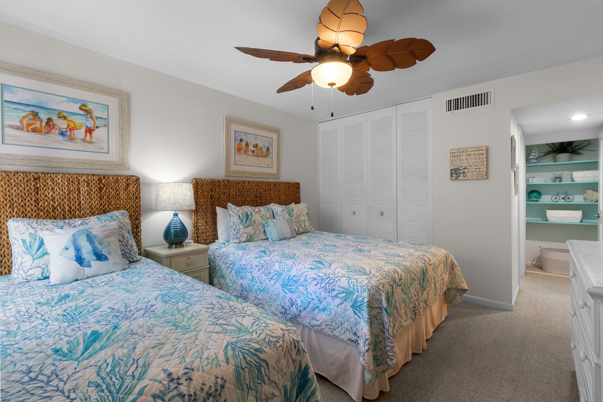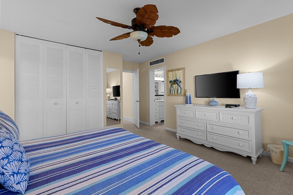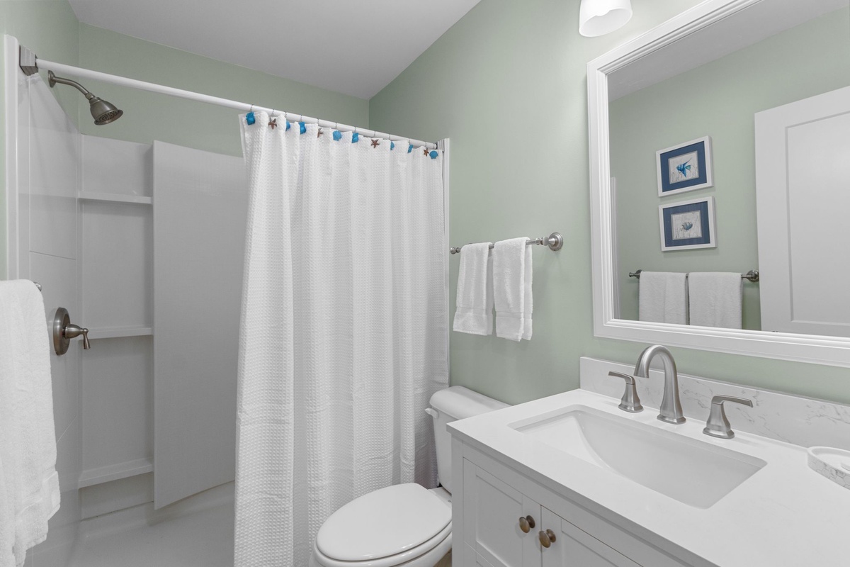 The grand staircase gives way to the second-story’s elegant guest suites, both reveling in comfort and charm. In one, a queen and twin xl bed anchor a space with magnificent scenery, flat-screen TV, ceiling fan and en suite bath with walk-in shower. The second, a king suite, enjoys a ceiling fan, flat-screen TV, wide picture window and en suite bath with tub and shower.