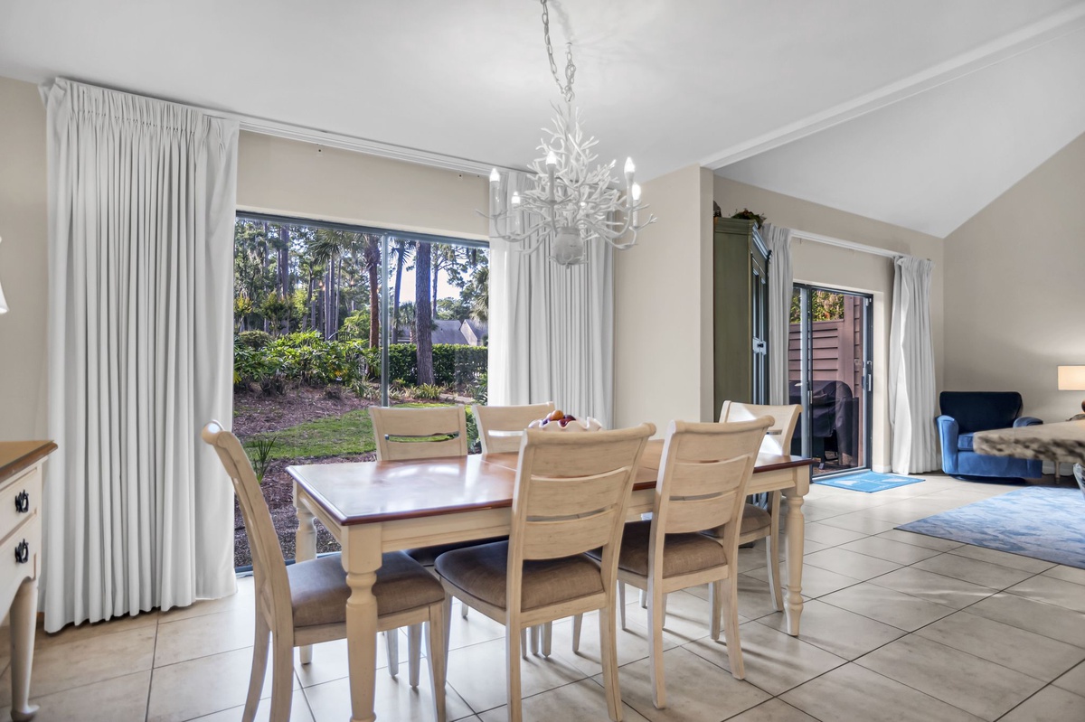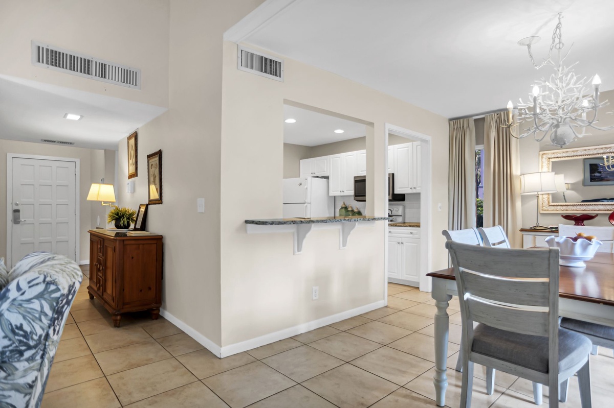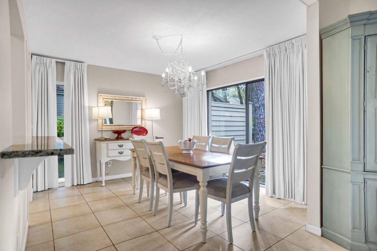 Also with a pool view is the dining room which seats six elegantly. Beautifully appointed, the kitchen showcases brown and cream granite countertops, white cabinetry with brushed nickel pulls, all major appliances and a nearby washer and dryer.