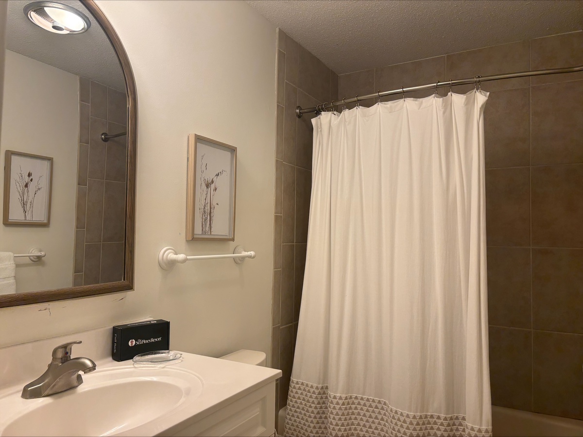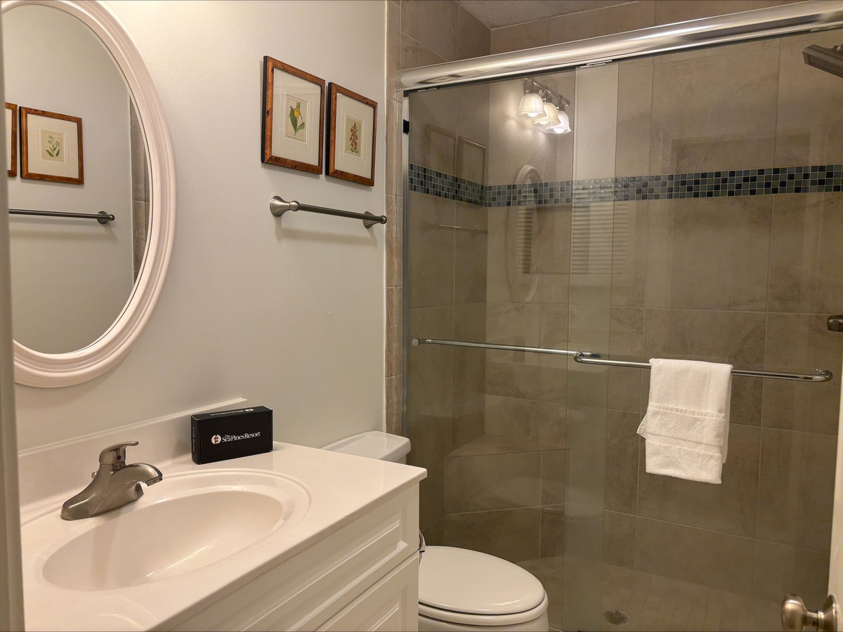 Located downstairs there is a bedroom featuring twin beds, a flat panel TV and a private bath in white and blue with a tub/shower combination.