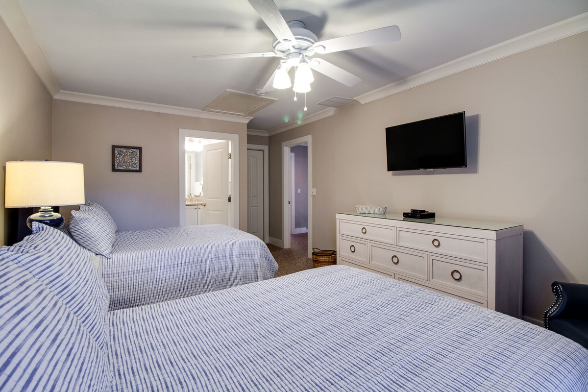 The first pairs two full-size beds in crisp white linens with highlights of salmon and royal blue, which carries onto a pair of wide headboards. This roomy suite is illuminated by ample windows, cooled by a wide ceiling fan and enjoys its own wall-mounted flat screen TV and private bath with marbled granite counters on a single basin vanity and walk-in shower with custom tile work.