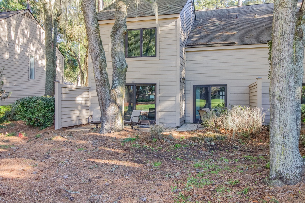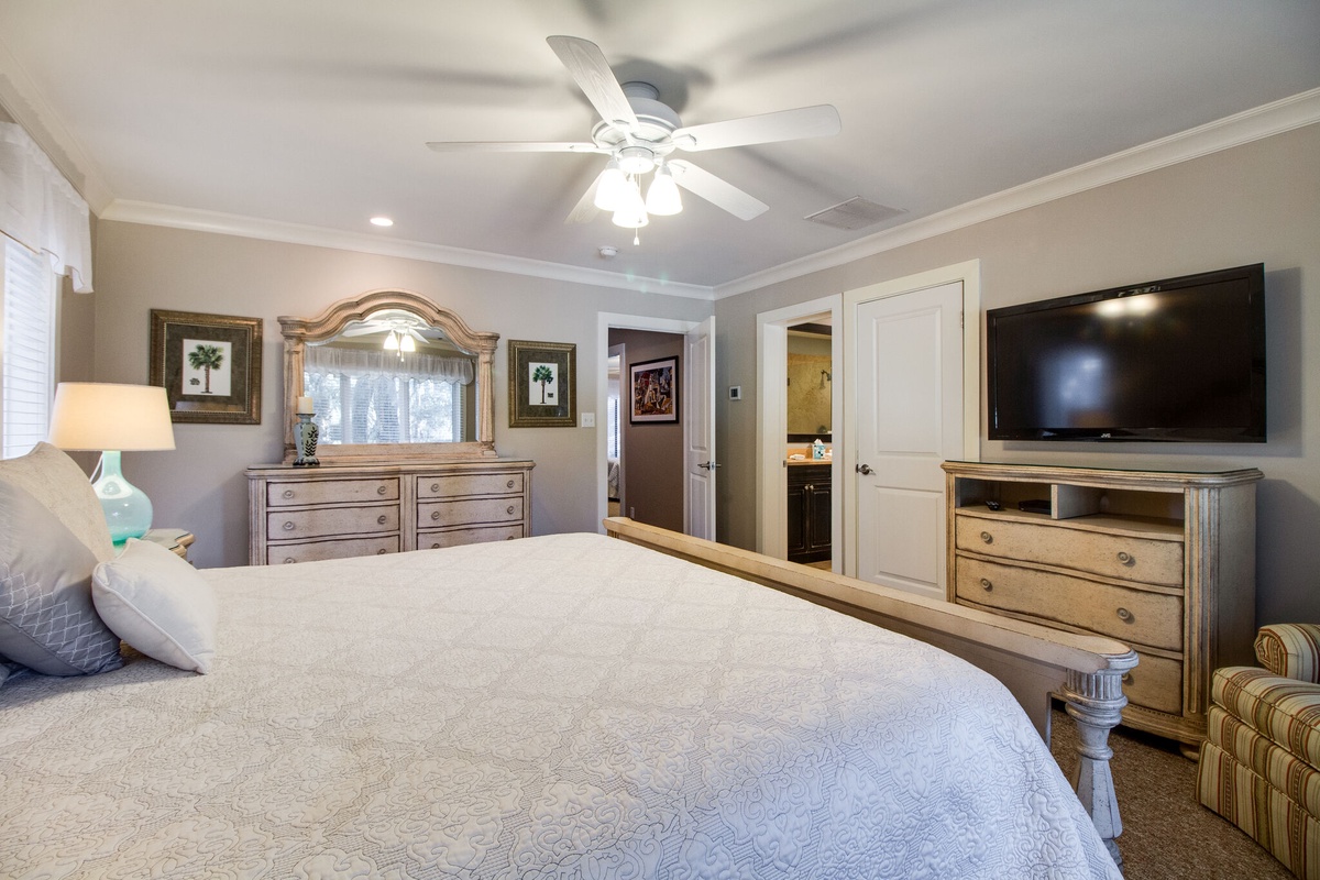 But the real star here is the golf view – step through sliding glass doors and you’re on a lush pebblestone patio with seating for two to drink in the splendid views of Harbour Town Golf Links. Separated by a small walkway is another patio, offering al fresco seating for four around a glass-topped table so you can enjoy dinner with a side of rolling greens.
