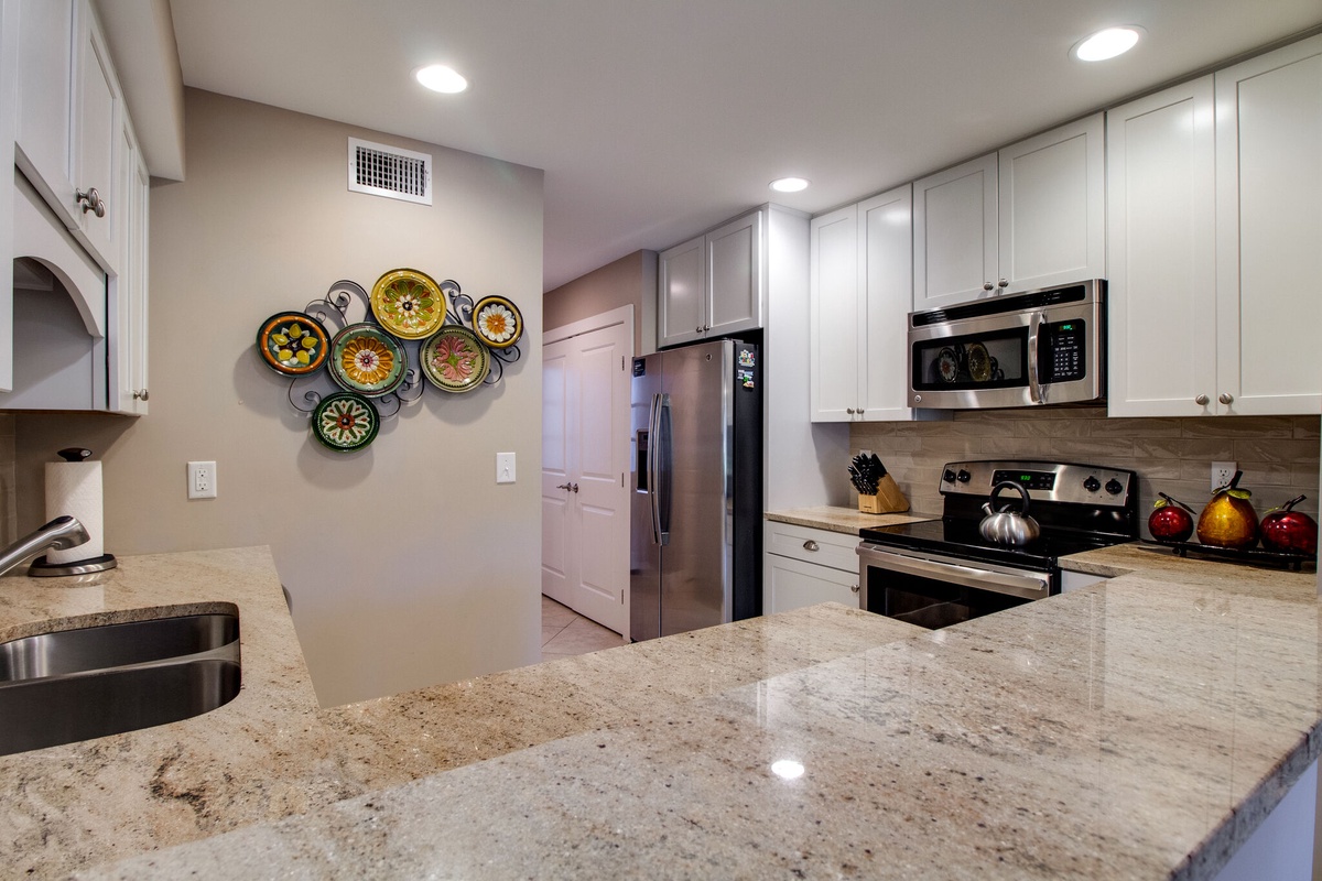 The nearby kitchen has been opened up beautifully to the dining room, with just a wide marbled granite counter separating the two. Beyond it is a kitchen oozing modern style with ivory-hued marbled granite countertops, tile backsplash and dazzling white cabinets with brushed steel hardware brightening the space. High-end stainless steel appliances from GE put a gourmet polish on a marvelously renovated kitchen.