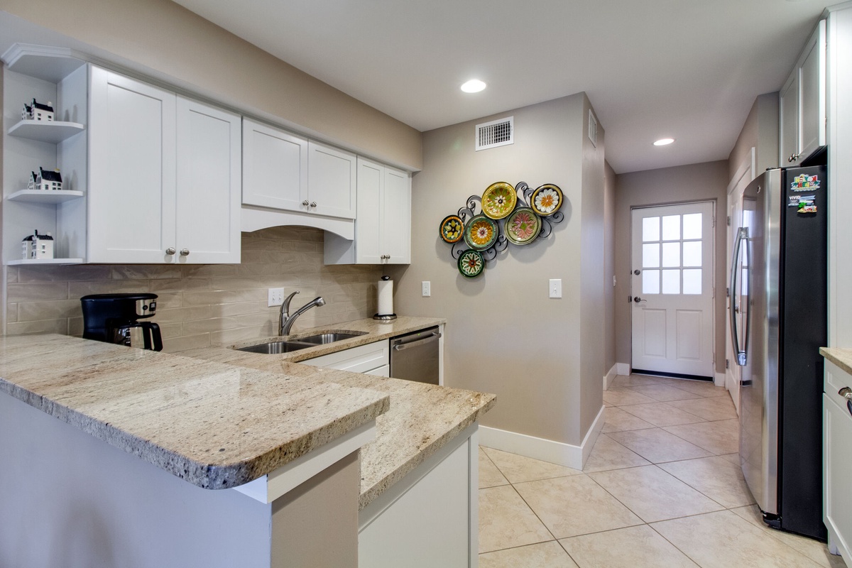 The main living areas of this home are awash in natural light, thanks to a plethora of windows, which brighten a superbly crafted color scheme of fog grey, light cocoa and taupe. This exquisitely modern motif is perfectly balanced in the living room, where you’ll find a sofa, loveseat and coral-patterned armchair situated around a massive flat-screen TV.