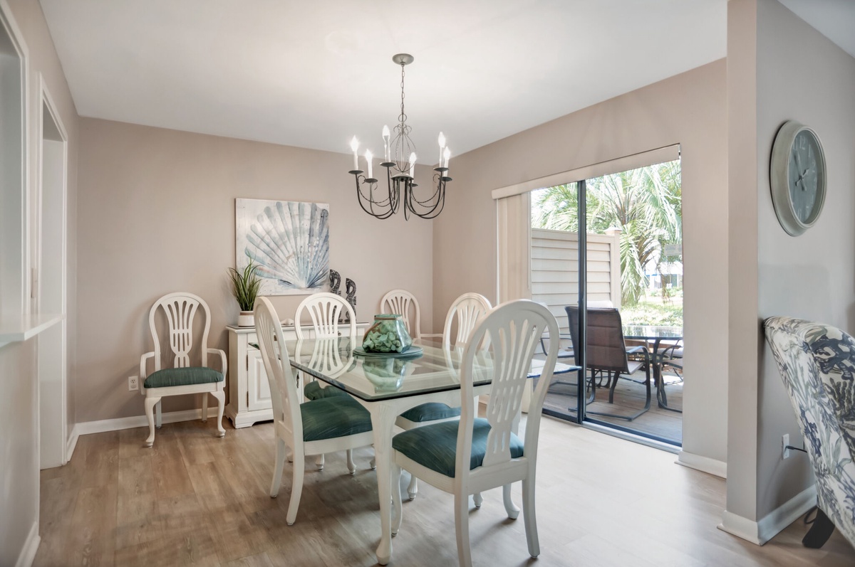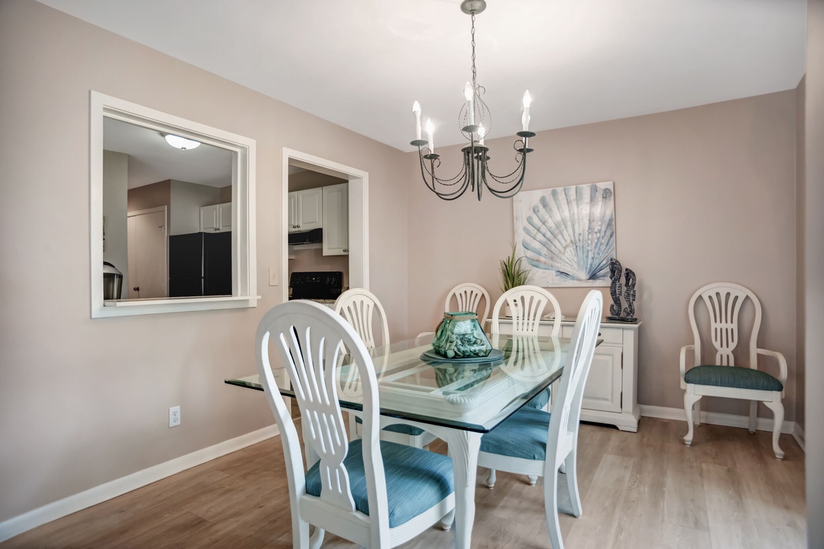 These same views illuminate the spacious dining room through another set of sliders, which open from a spacious patio, coaxing natural light into a space where a beveled-edge glass dining table seats six in comfort. A pass-through provides easy access to the kitchen, where granite counters encircle a full suite of updated appliances including a flat cooktop stove.