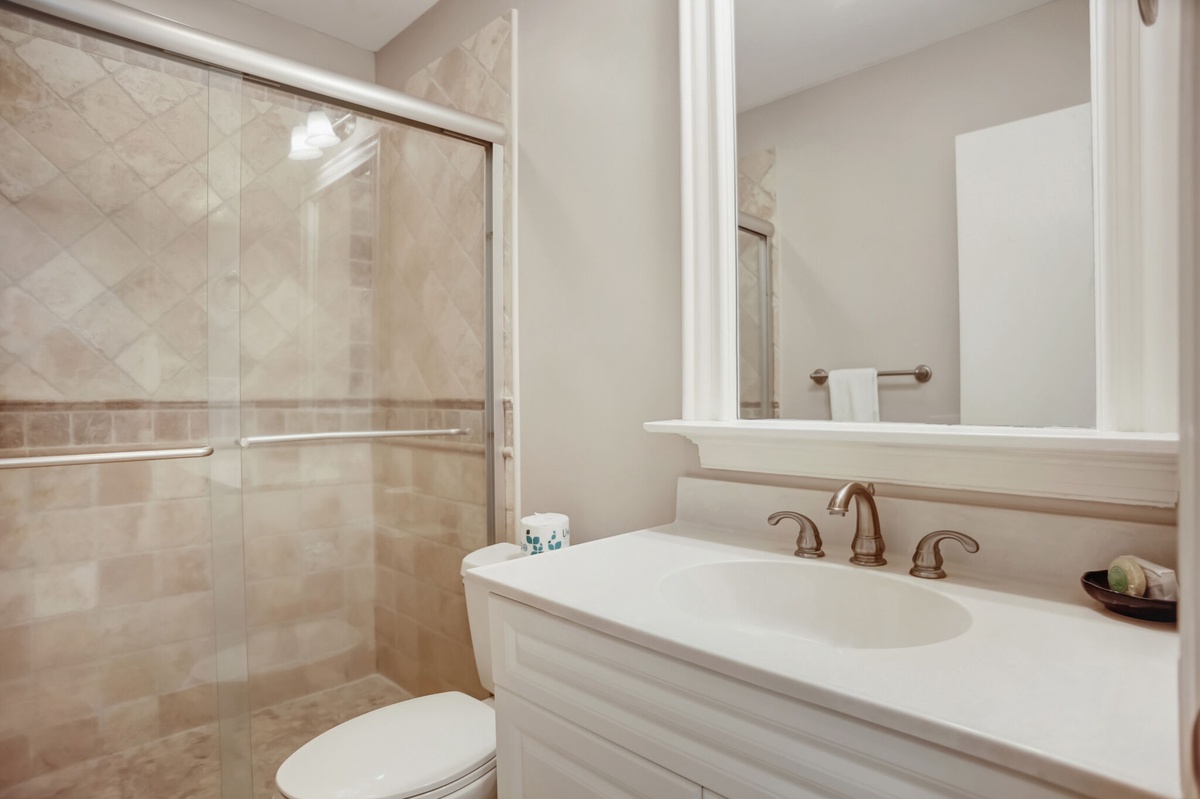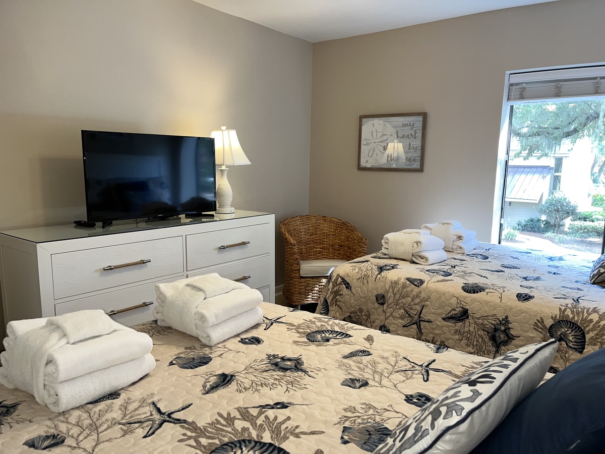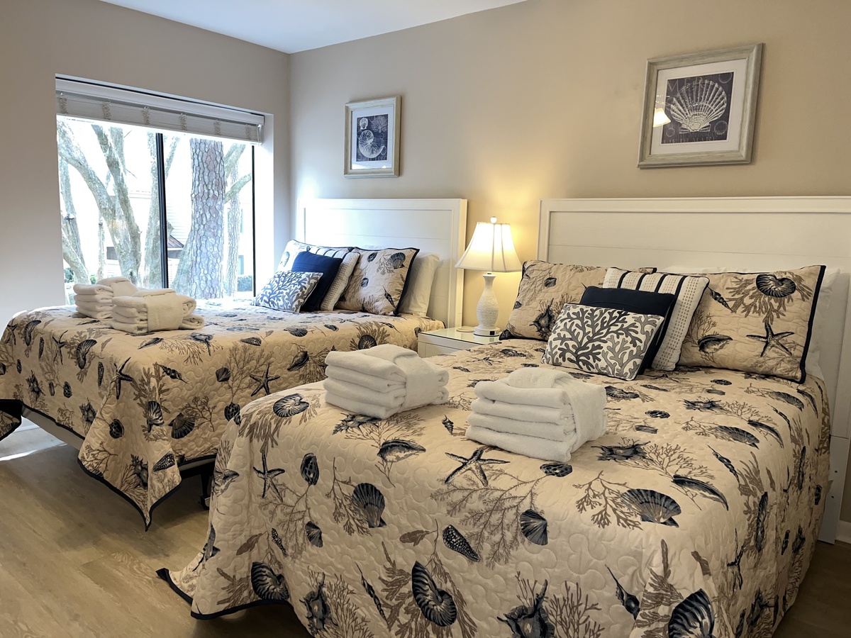 The first bedroom sees two double beds anchoring an exquisitely realized nautical theme that carries from the linens to the artwork on the walls in a space boasting a ceiling fan, flat-screen TV and en suite with walk-in shower and wide single-basin vanity.