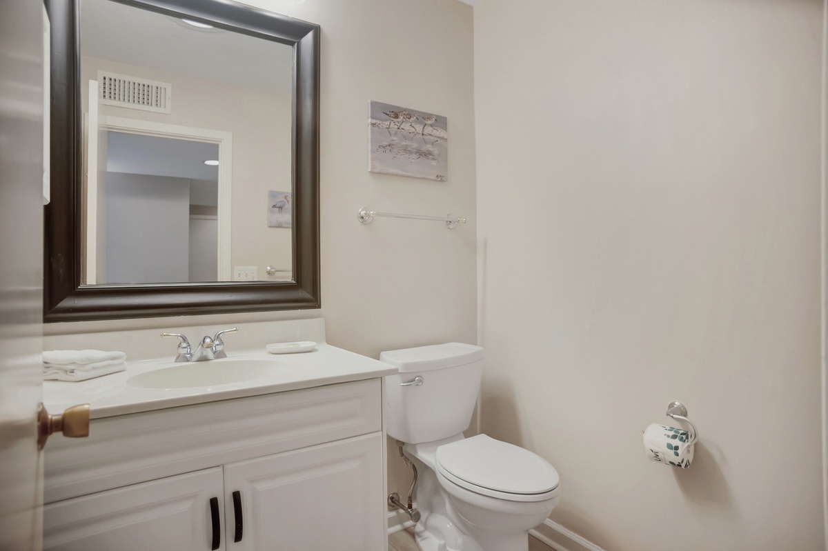 The main floor welcomes you with soothing neutral tones and flooring mimicking the look of hardwood, which runs throughout the marvelously open living space. It draws you toward a comfortable family room pairing dual armchairs against a plush sleeper sofa before a massive flat-screen TV. A bank of sliders open to a wide patio with mesmerizing oak-shaded lagoon views beyond.