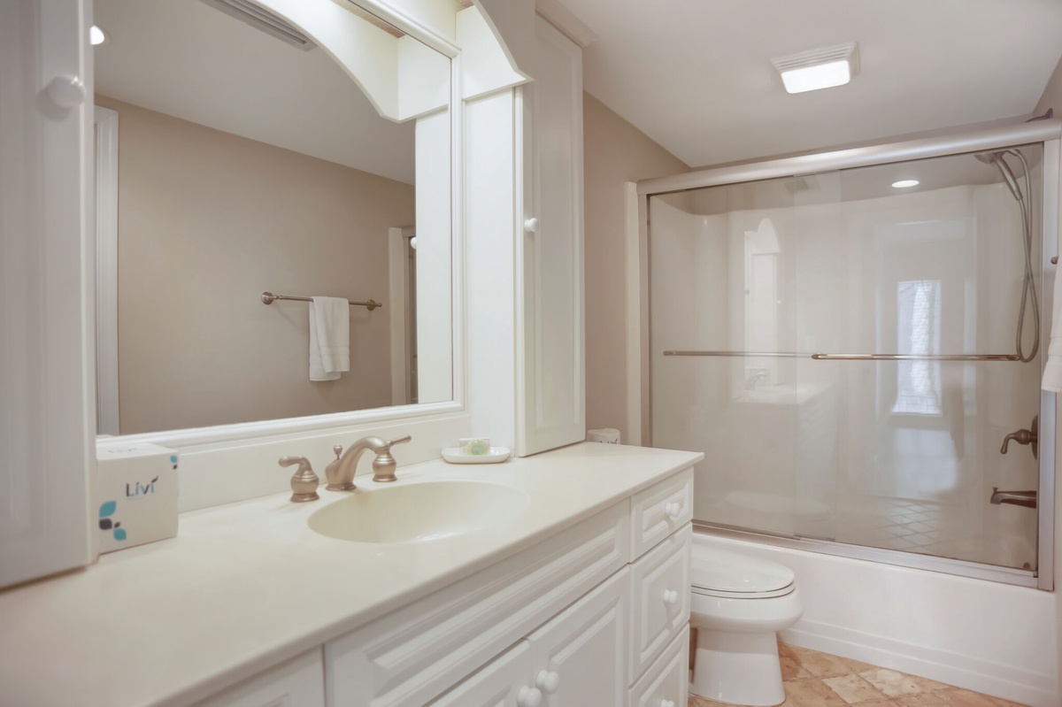 The master ups the ante with a spacious king size bed enjoying exquisite lagoon views through wide windows. Amenities throughout include a ceiling fan, flat-screen TV concealed within an armoire and en suite with tub shower combo and marvelous built-ins surrounding a single-basin vanity.