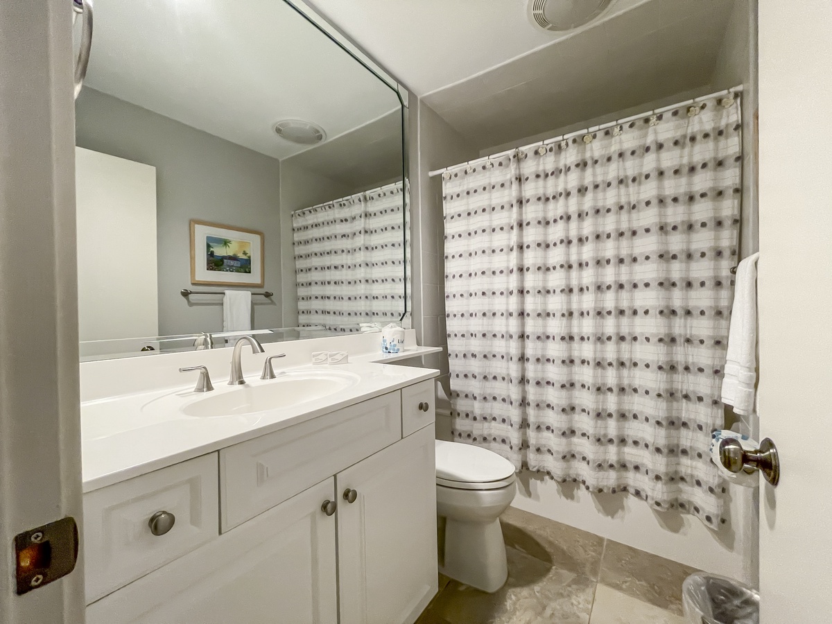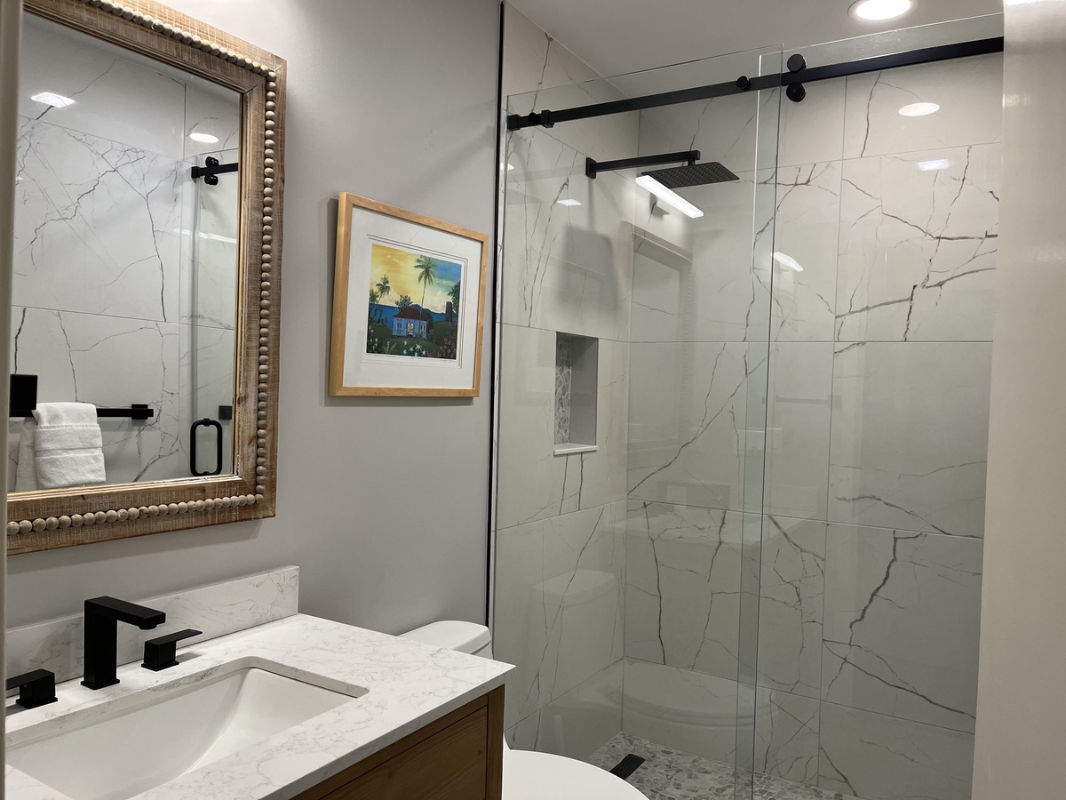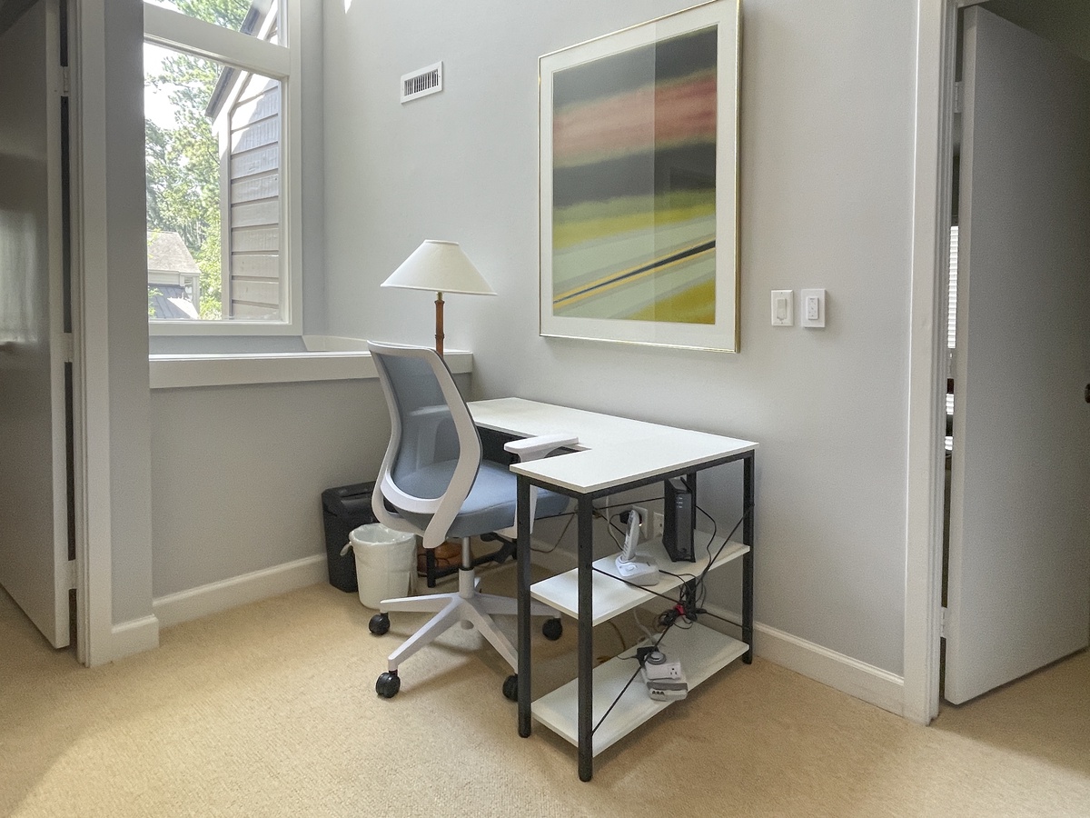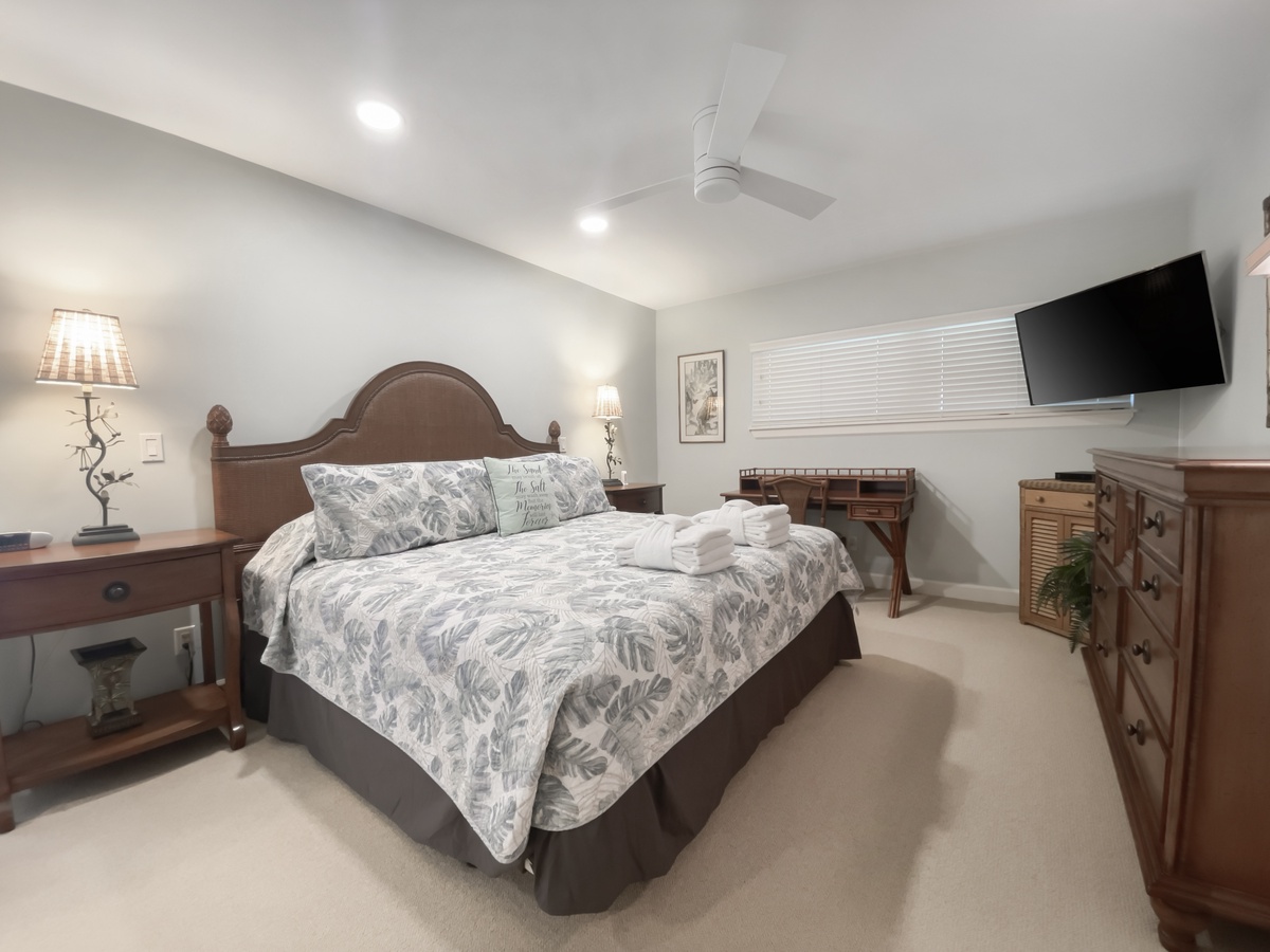 The expansive kitchen offers both style and convenience, with wide granite counters, updated appliances and a concealed washer and dryer. Also on the ground floor, the first of three spacious suites sets the stage for the comforts that await. Set off by a private foyer, this private getaway boasts a king-size bed, ceiling fan, flat-screen TV and private bath with tub and shower.