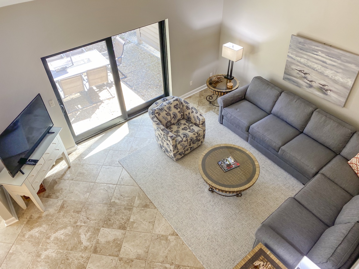 An inspiring sense of openness pervades the main living spaces, courtesy of soaring cathedral ceilings over a central second-story loft. In the living room, these ceilings cascade toward doors of sliding glass above a spacious room with roomy sectional sofa and flat-screen TV. A nearby formal dining room boasts high-top seating for six expandable to eight.