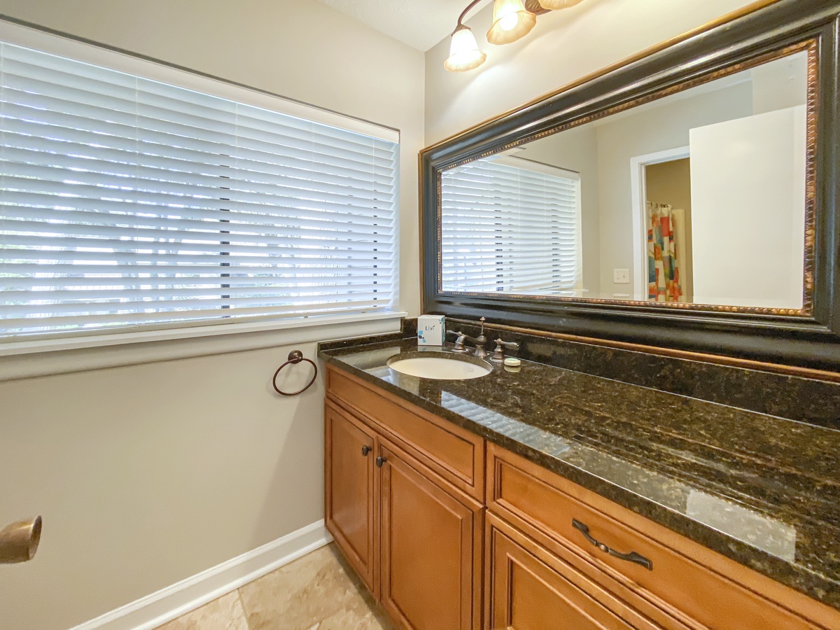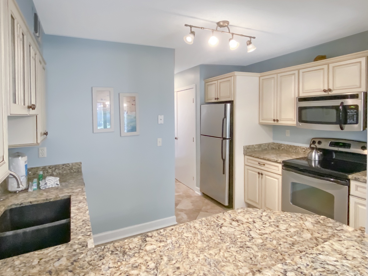Rounding out the many comforts of the communal areas, the expansive kitchen boasts updated counters of mottled granite surrounding state-of-the-art stainless steel appliances, while a nearby set of French doors conceal a washer and dryer.