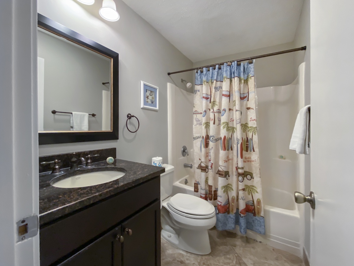 The first of three guest rooms can be found on the ground floor, a spacious suite offering a queen and twin bed. Infused with oceanside charm, this room enjoys a flat-screen TV and en suite with tub and shower which can be closed off as a separate foyer area.