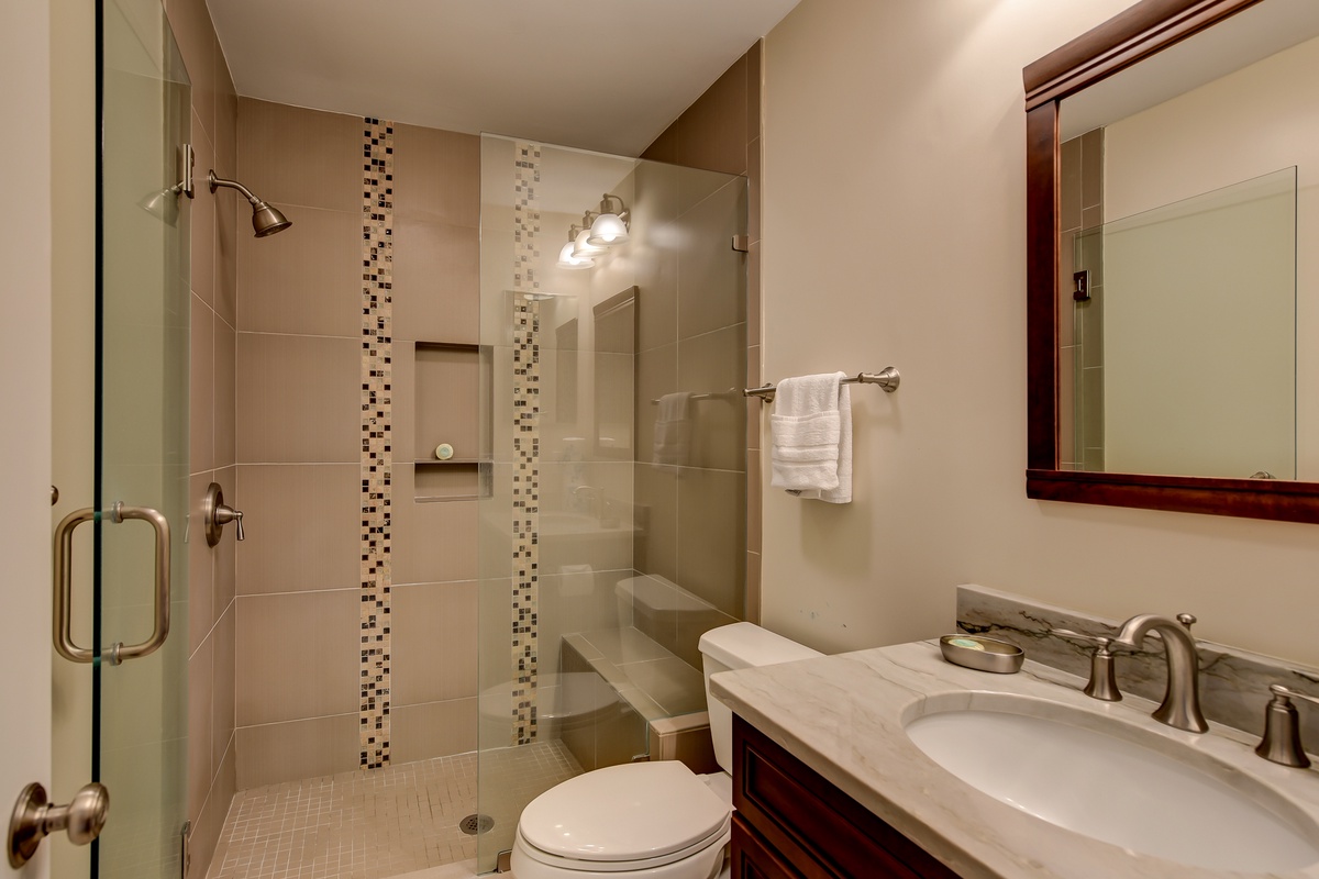 With bead-board furnishings, the charming second bedroom features swing king bed (which can either be a king-sized bed or twins), and walk-in shower in its private bathroom.