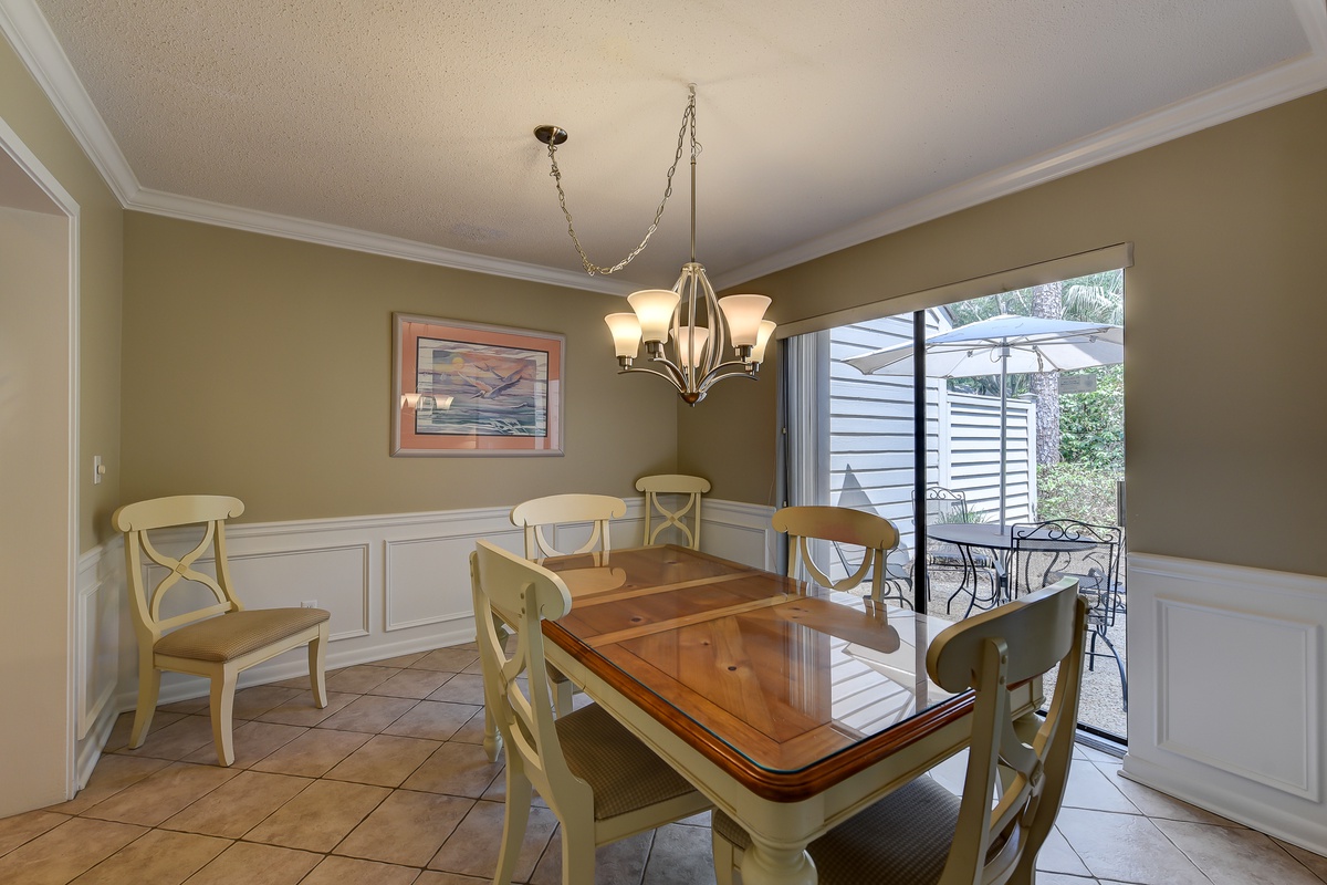 With stone flooring and lovely wainscoting, the dining area provides seating for six, and also a view of the pool.