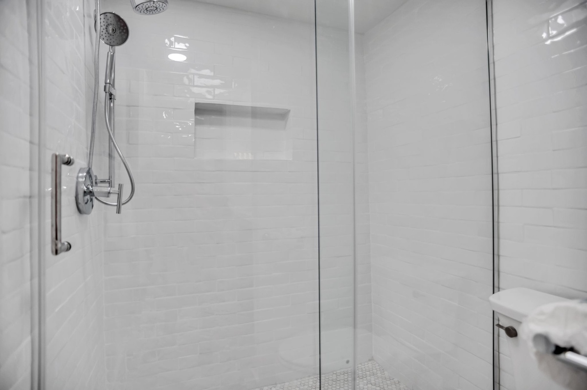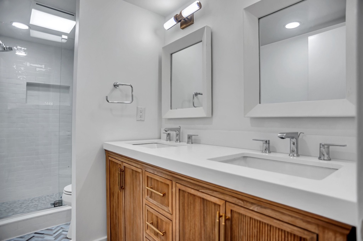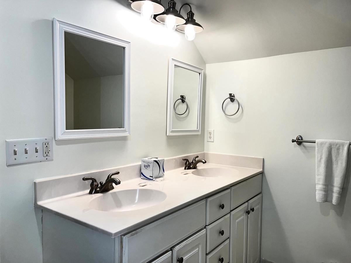 The guest rooms can all be found up the carpeted stairwell, each updated for coastal comfort. At the top of this three-story villa, two guest rooms one with a queen size bed and twin sleeper chair and the other with a king bed share access to a spacious full bath with dual-basin vanity, tub and shower. On the next floor down, we come to a pair of suites. In the first, a king-size bed anchors a space with flat-screen TV, ceiling fan, spacious closets and en suite bath with walk-in shower. Finally, inspired updates have given the primary suite indelible elegance, with a wall-mounted flat-screen TV and renovated en suite bath boasting dual-basin vanity and walk-in shower.