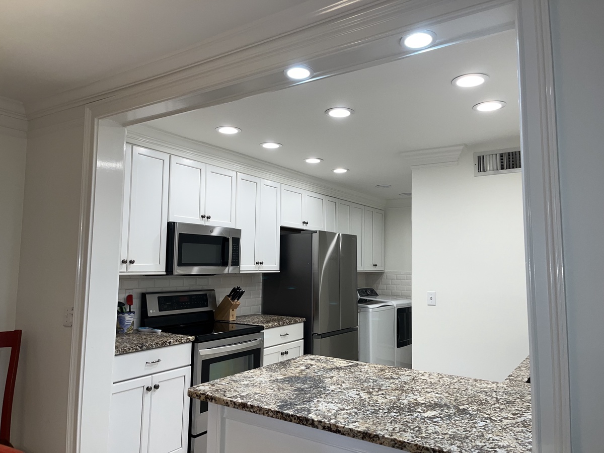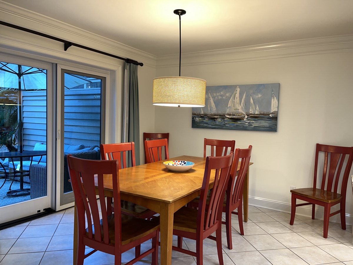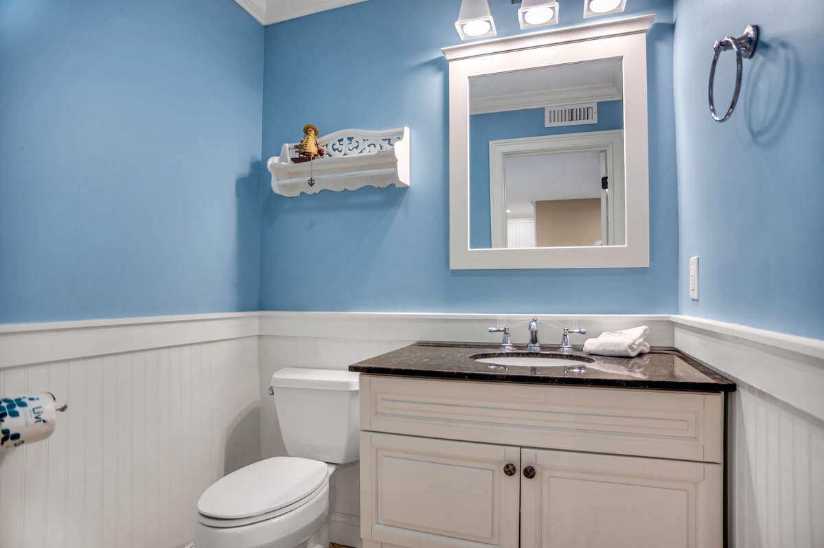 The ground floor provides a light and breezy transition through several distinct areas for relaxation. In the living room, dual sofas, one a sleeper sofa, face a wide flat-screen TV flanked by sliders gazing out on lush landscaping. Nearby, formal dining for six opens to the elegant kitchen with speckled granite counters and stainless steel updated appliances.