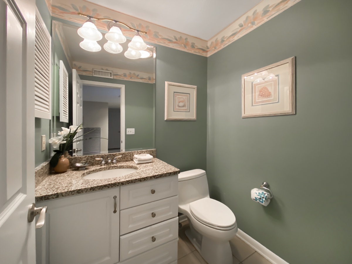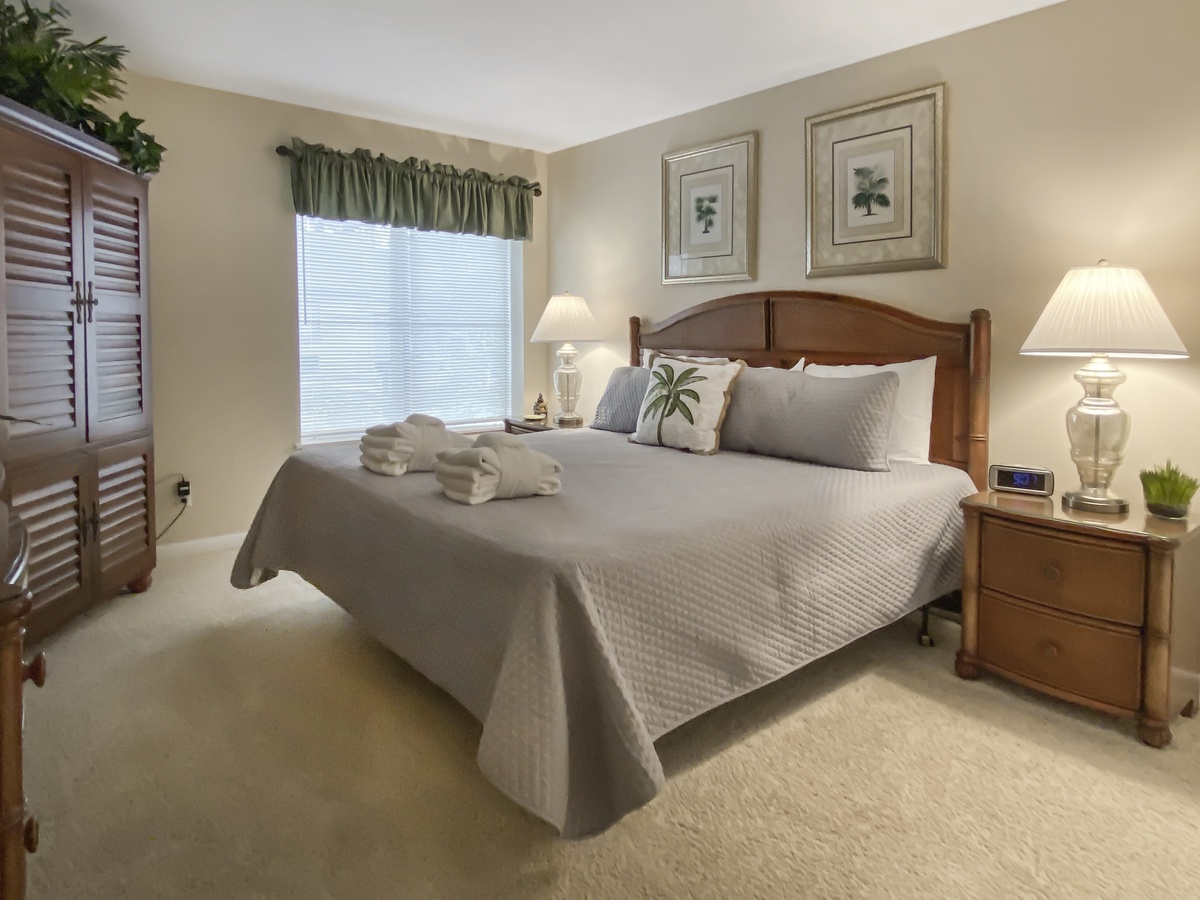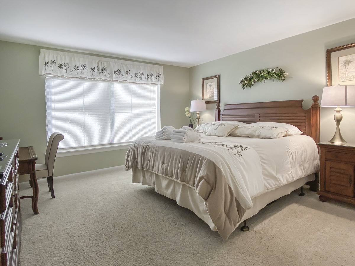 On the second level is the restful master bedroom in a soft color scheme, featuring a king-sized bed, TV and private bath including spacious vanity with scalloped sink and tub/shower. Viewing the on-site swimming pool below, this bedroom room sits among moss-draped oaks and towering palmettos. Also with a king-sized bed and TV, the second bedroom is adorned in shades of palm and taupe. Its private bath features a walk-in shower.