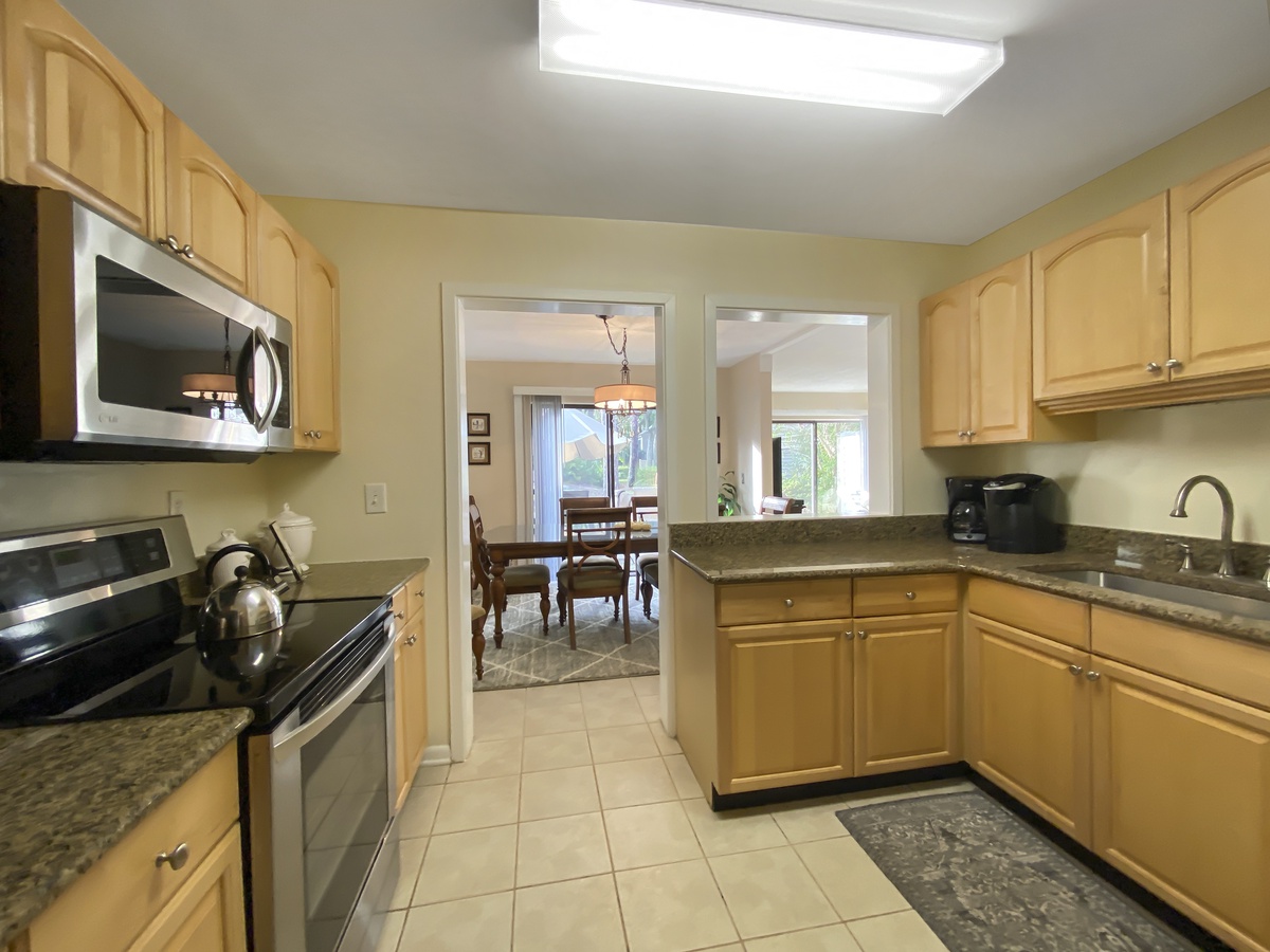 Sliding glass doors access the back patio from both the living room as well as dining room, which seats eight elegantly at its plantation-style table. A pass-through window is open to the kitchen.
