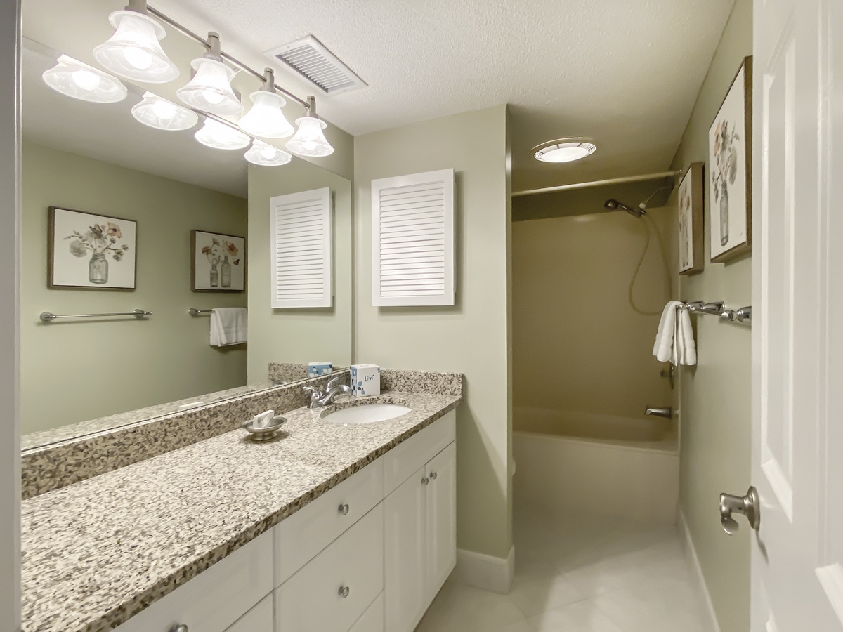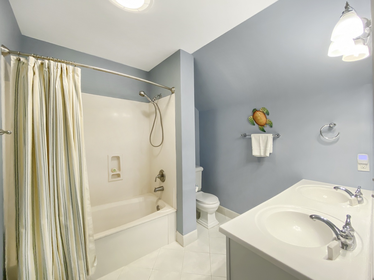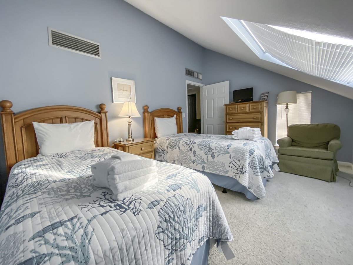 On the third level are two more bedrooms, each with twin beds, TVs and ceiling fans. These charming bedrooms share a bathroom with tub/shower combo and a double vanity.