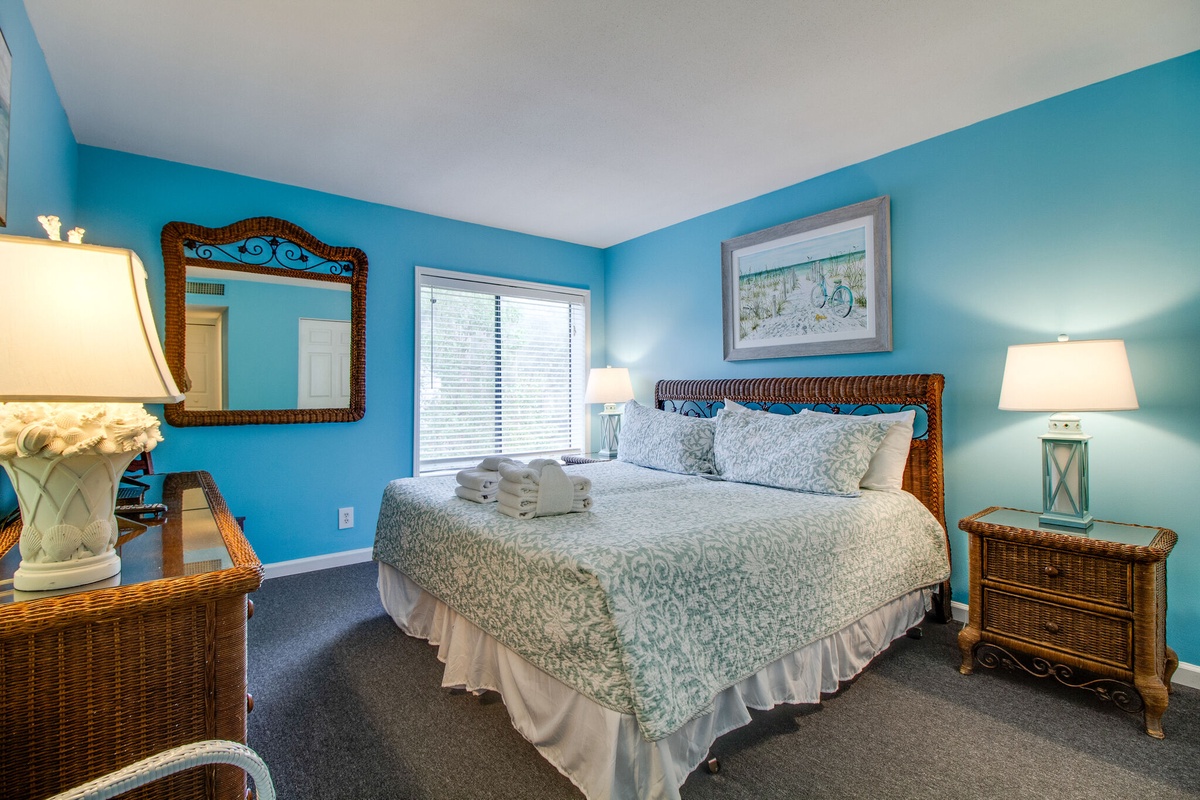 In a palate of soft green and light yellow, the second bedroom – also on the second floor – offers a swing king which can be two twin beds, with an elegant dark wicker and oil-rubbed bronze headboard. The room also houses a large flat screen TV and charming accessories. A private bath provides a spacious shower with a bench.