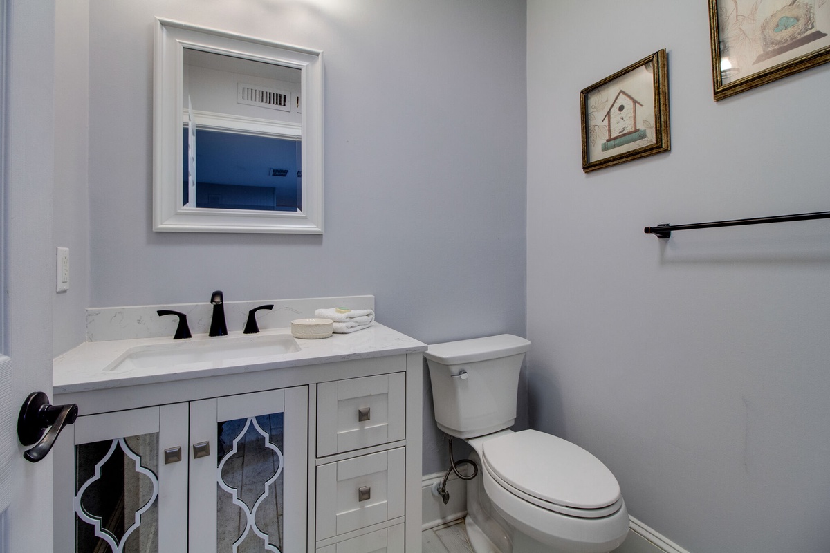 Also on the first level is a charming half bath with a scrolled iron light fixture and lovely accessories.