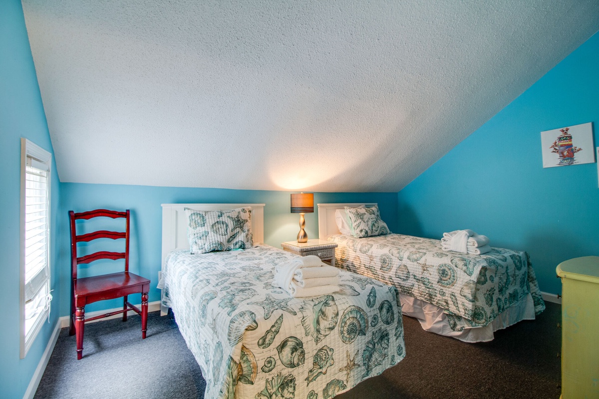 The third level holds two additional bedrooms, each with two twin beds. One of the duo of bedrooms, with quietly sunny walls, features white wicker furnishings and has quilted spreads in stylish aqua and coral hues. It showcases a large, wall-mounted flat screen TV.