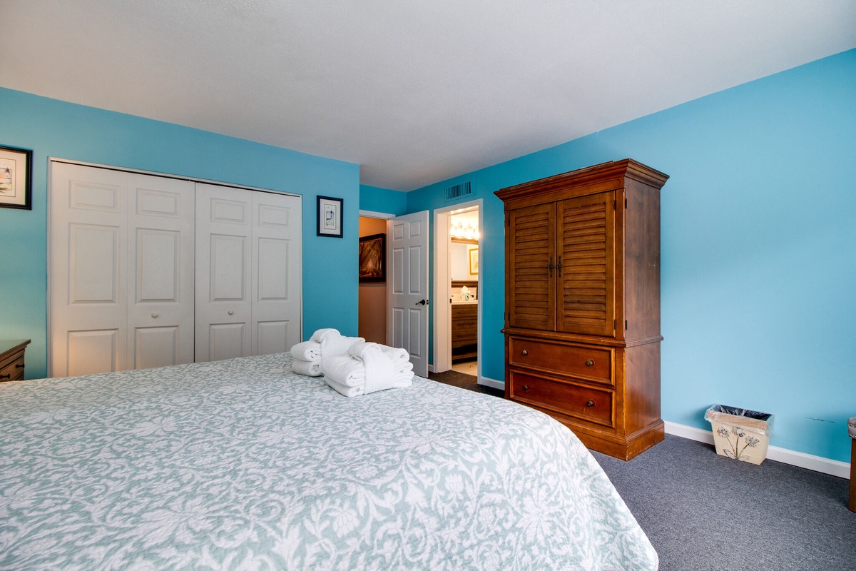 On the second floor is the tranquil master bedroom in restful shades of blue. The master also views the lagoon below, and features a luxe swing king-sized bed which can be set up as two twin beds. An armoire holds a large flat screen TV. In soft seafoam green, the master bath has a wide solid surface vanity and a tub/shower combination.