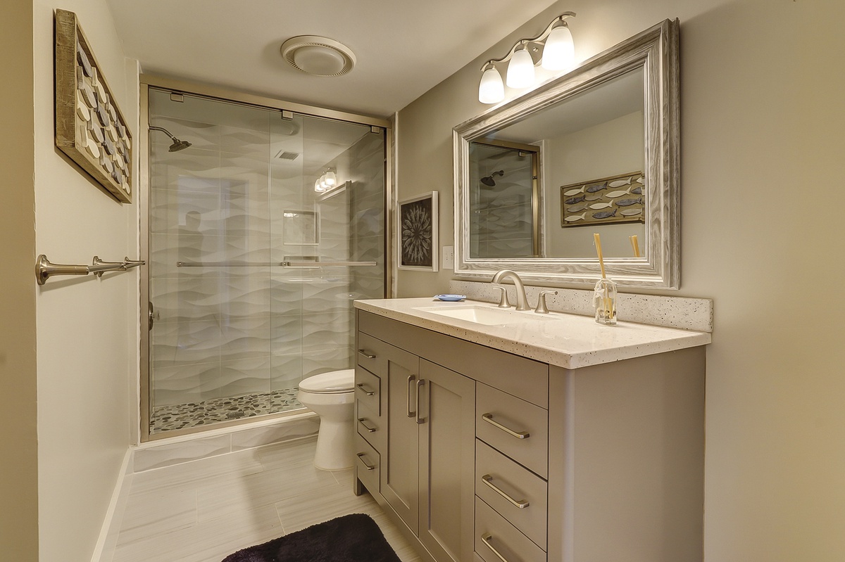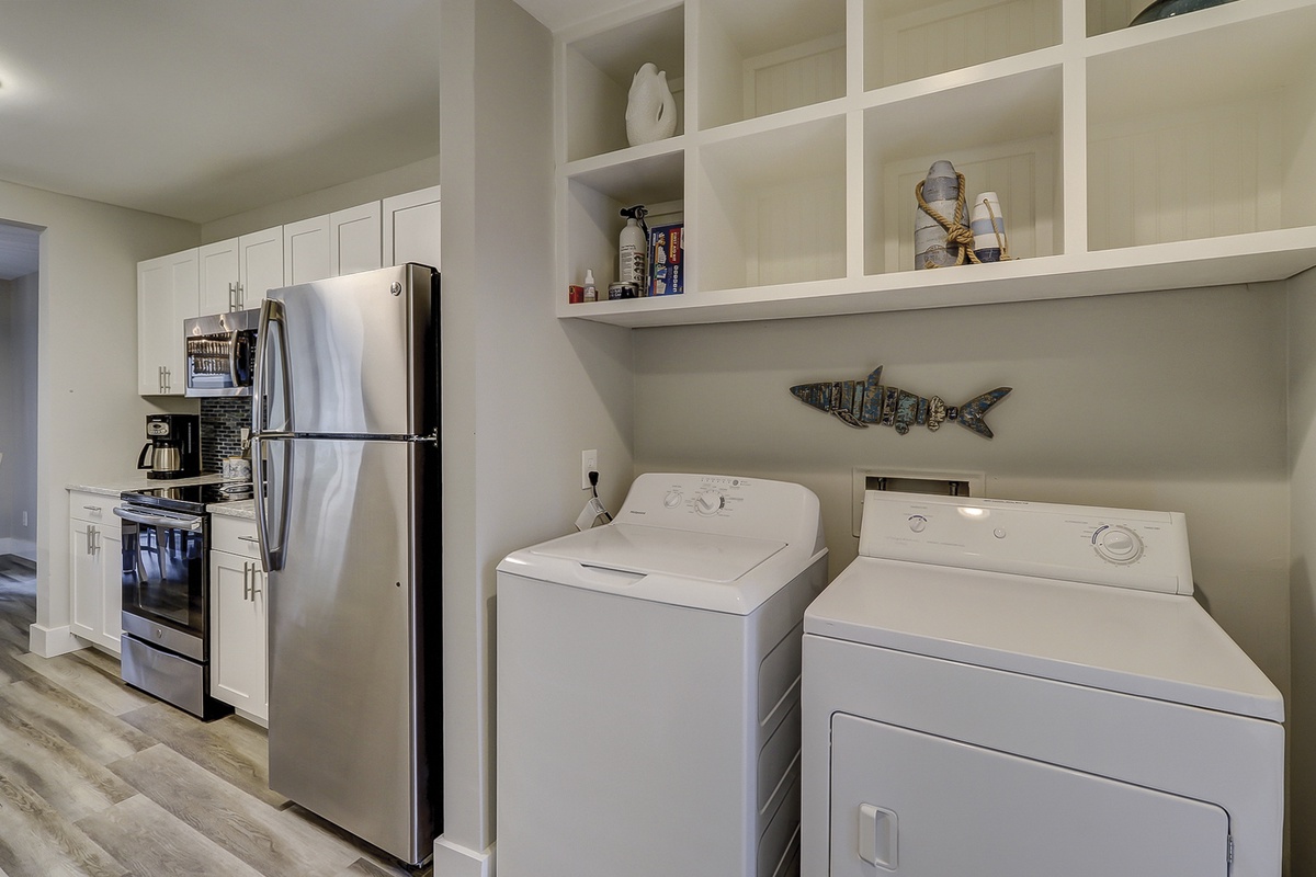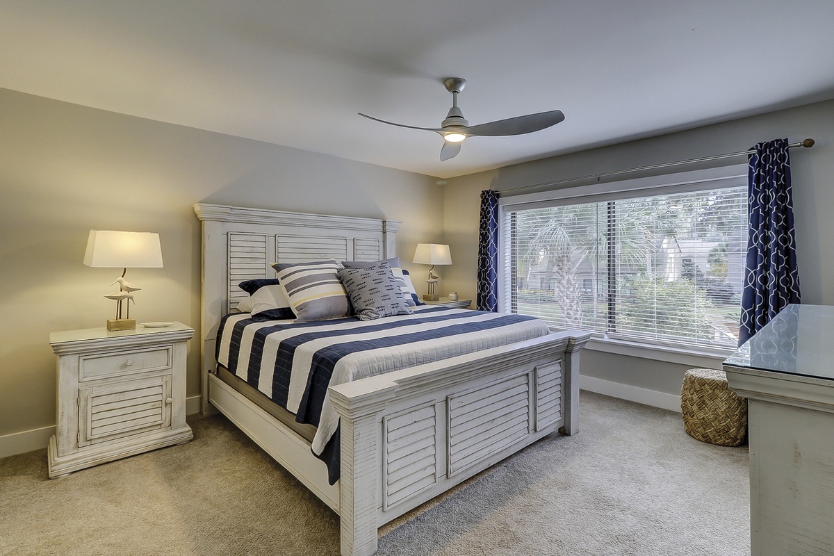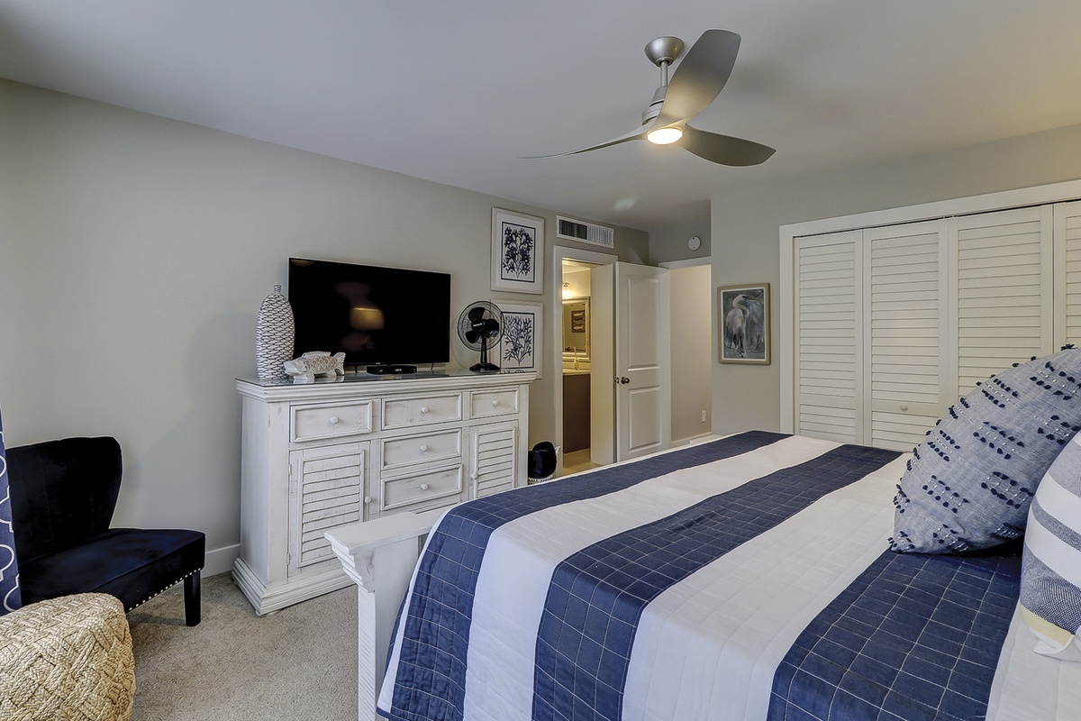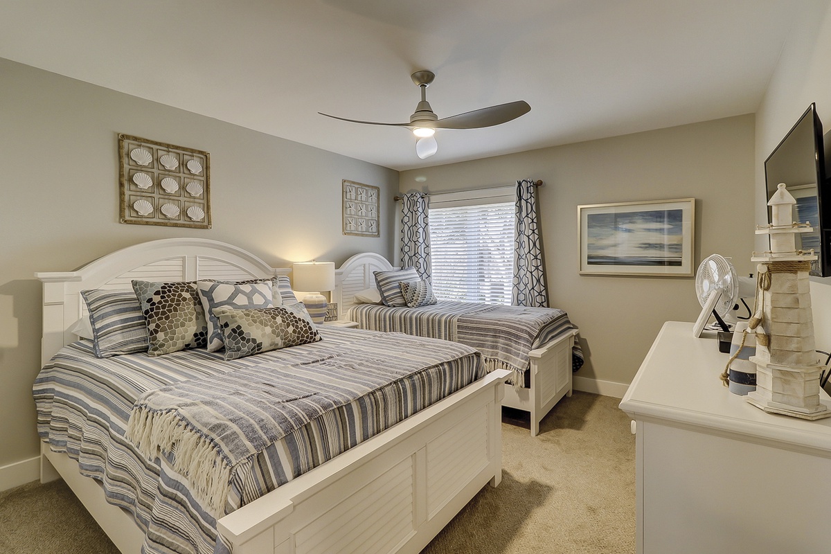 The upstairs guest rooms enjoy the same updated coastal vibe, adding to it blissful comfort. In one room, a queen and a twin bed anchor a space which enjoys a flat-screen TV and full bath with walk-in shower. In the other, the master suite indulges with scenic lagoon views, roomy king-size bed, flat-screen TV and en suite bath with walk-in shower.