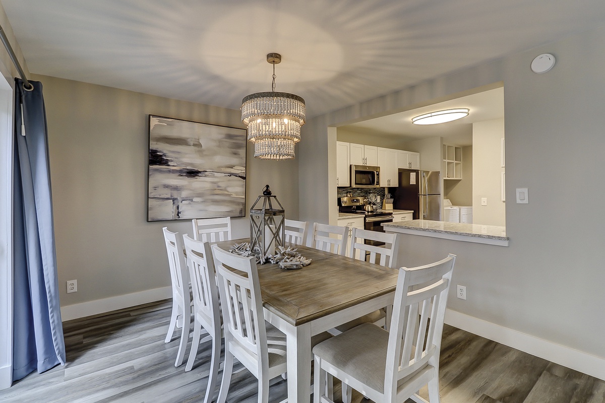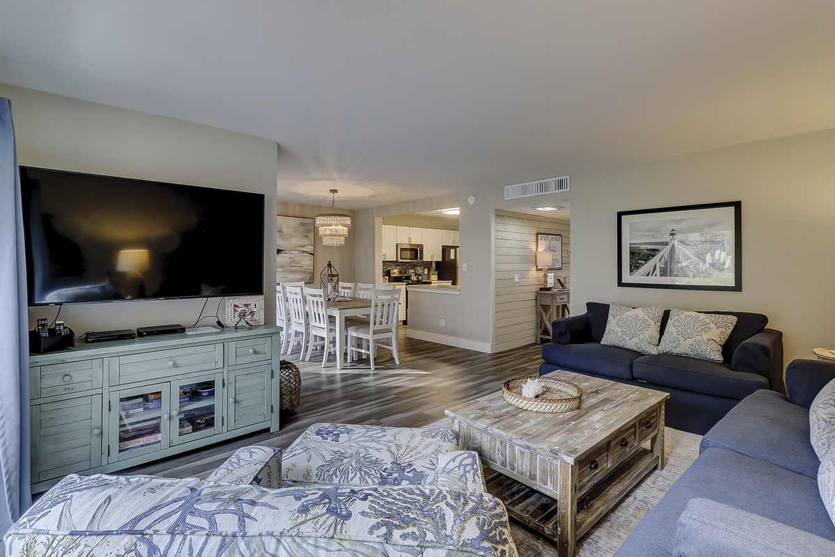 Crafted in comfort and designed with an eye for Lowcountry chic style, the main living spaces of this villa exult in tranquil lagoon views. This scenery is framed by a wall of sliding glass in the main living space, where a sofa and loveseat front a large flat-screen TV.