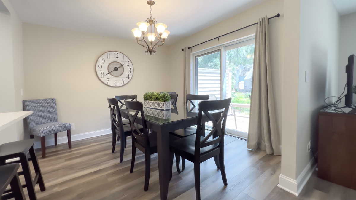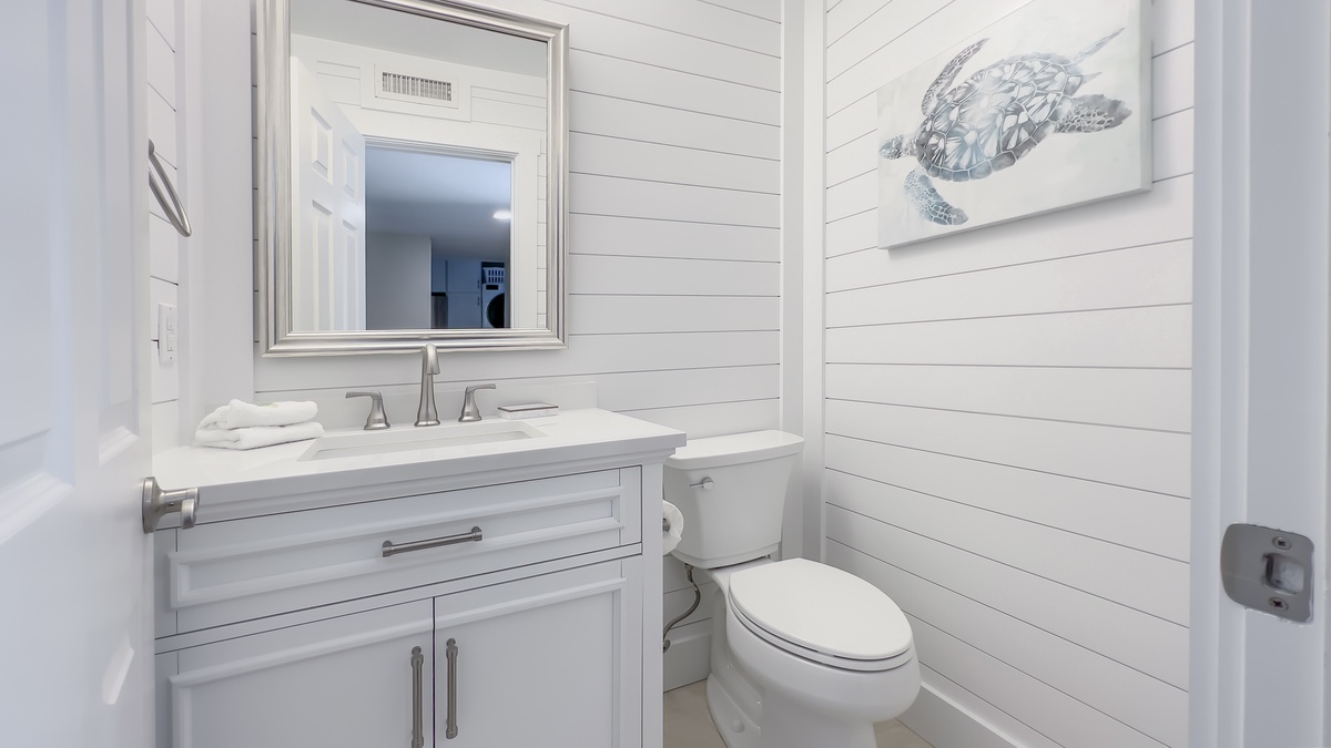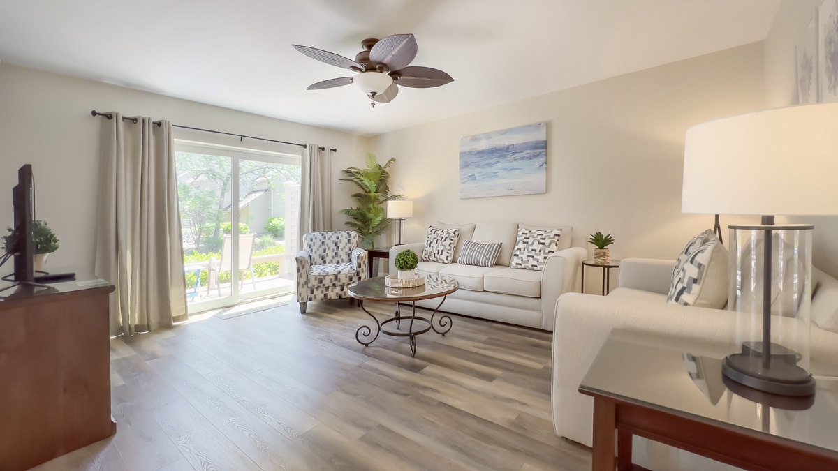 Draped in rich coastal finery and updated to reflect a relaxed sense of Lowcountry chic, this dazzling villa indulges with refined flair and a location in the heart of Sea Pines. The great room’s cream sofa and loveseat contrast with rich wide-plan LVP flooring, facing a flat-screen TV and flanked by a wide set of sliders gazing out across rich landscaping. Another set of sliders, tucked behind a modern dining table with seating for six, share access to a wide wood patio at the edge of a tranquil lagoon beneath the shade of live oak boughs.