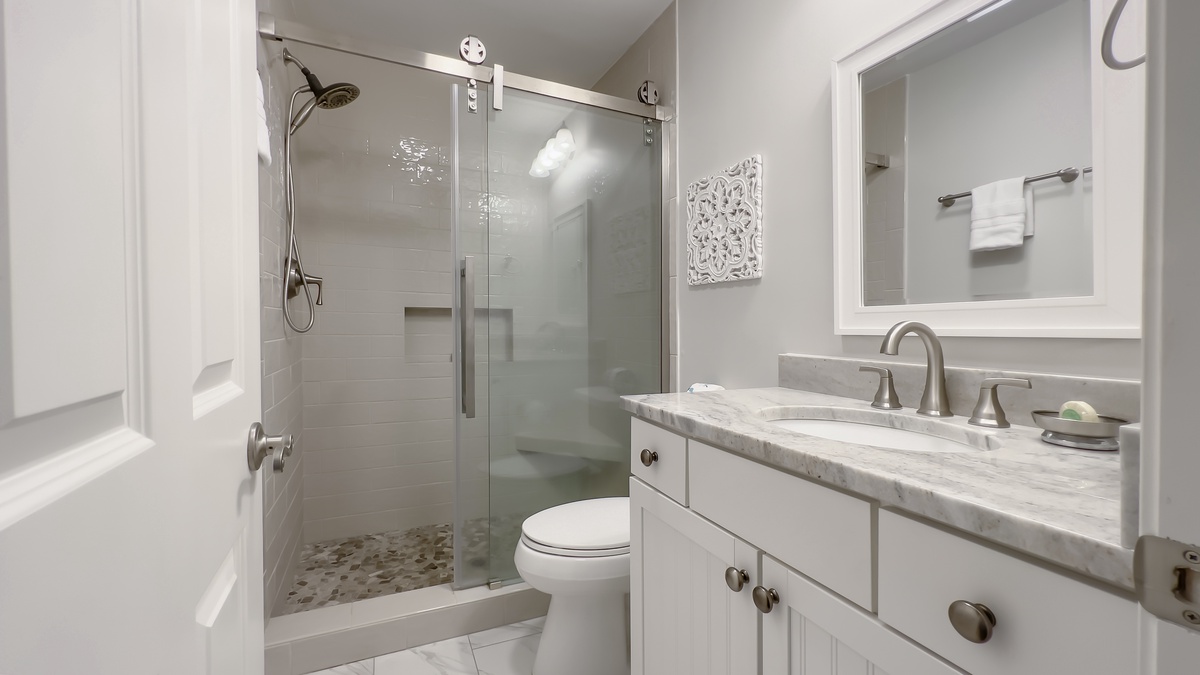 Open to the dining room, the renovated kitchen boasts exquisite finishes and updated stainless steel appliances, with a nearby washer and dryer for the conveniences of home. Even the ground floor powder room benefits from inspired updates, with nickle-gap shiplap running throughout.