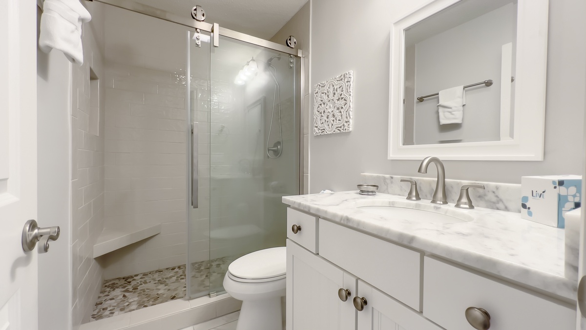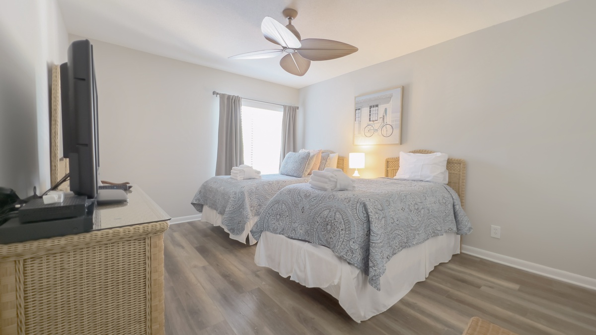 Each of the guest rooms has been equally refreshed, with two king suites on the second floor. Each enjoys a king-size bed, ceiling fan, flat-screen TV and en suite bath, with a walk-in shower in one and a tub and shower in the other. The third floor boasts two more guest rooms, each pairing dual twin beds before a flat-screen TV with shared access to a full bath with walk-in shower.