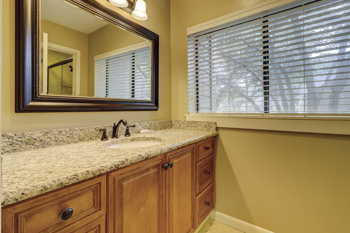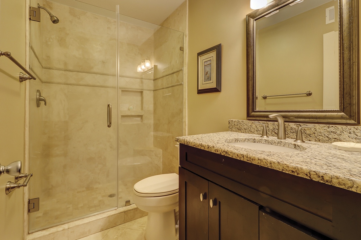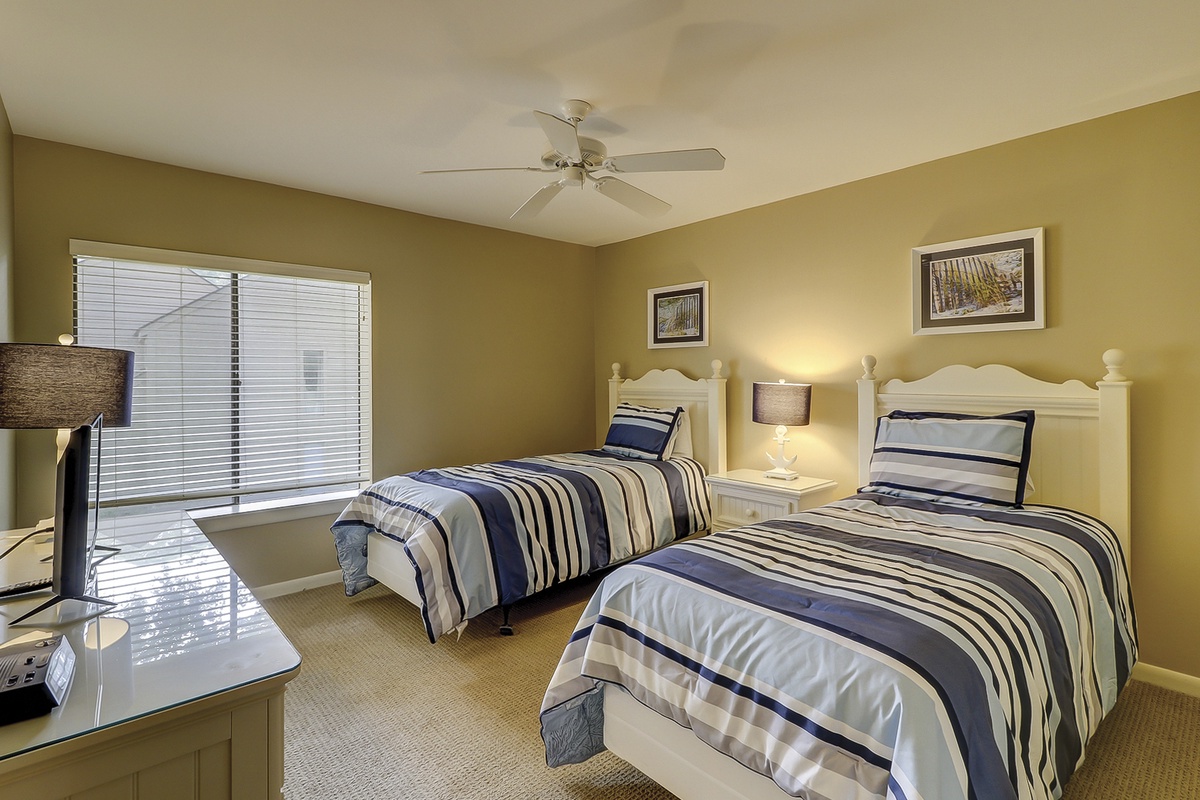 Upstairs, the master bedroom maintains the seaside palette, offering a king-sized bed, flat screen TV, ceiling fan and golf view. Its renovated master bath provides a wide granite vanity with oil-rubbed bronze fixtures and a roomy glass door shower.