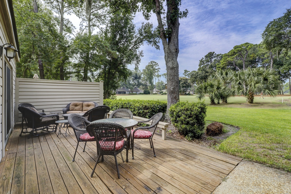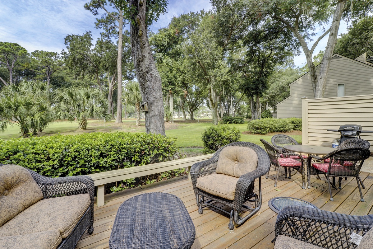 In shoreside hues of sky and sea, the airy living room affords plenty of comfortable seating, a flat screen TV and newly installed sliding glass doors that allow access to the extensive back deck and the verdant fairway views. The deck also holds two chaise lounges as well as stylish weatherproofed wicker chairs and table that allow for al fresco dining amid palmettos and oaks.