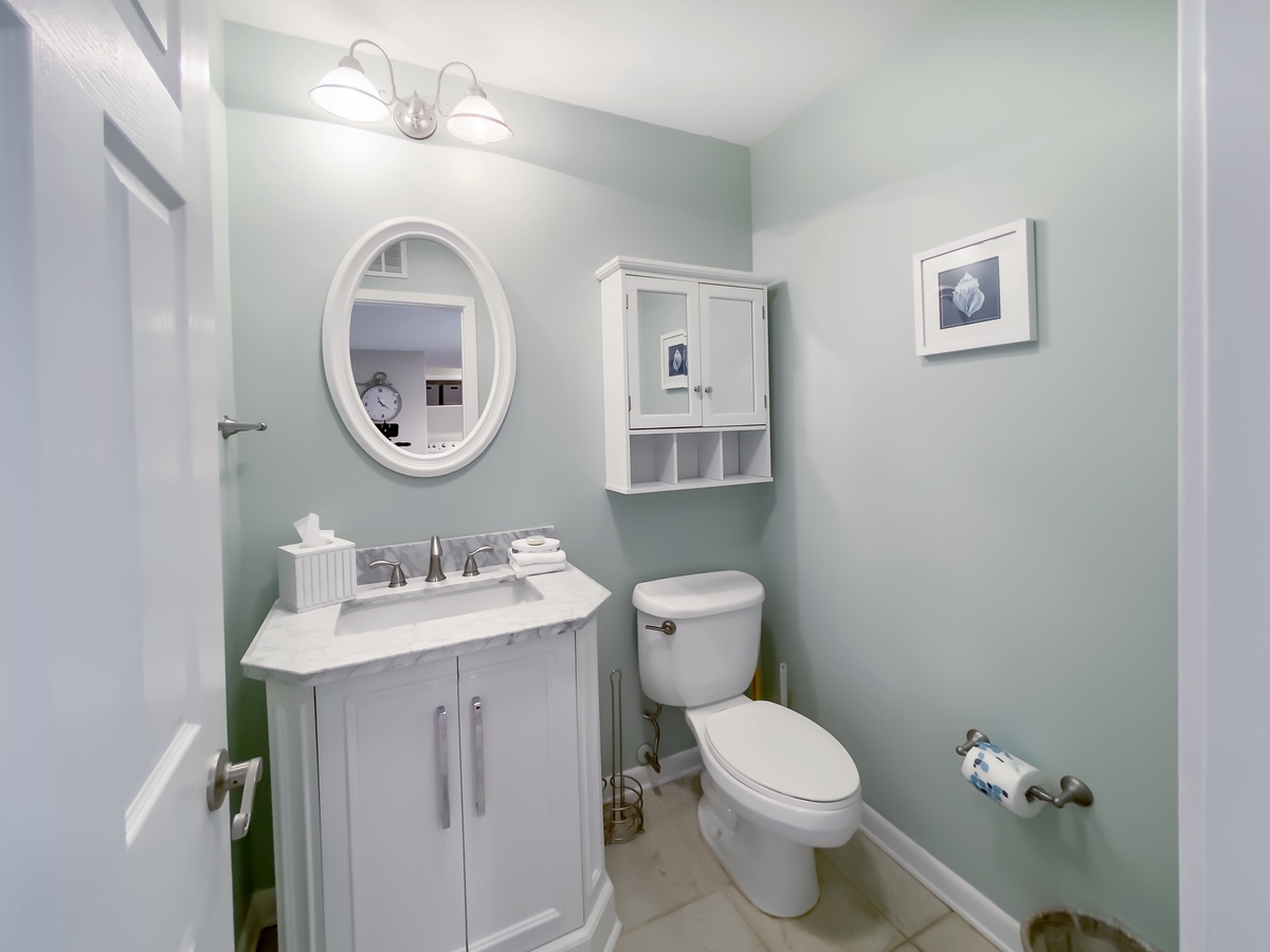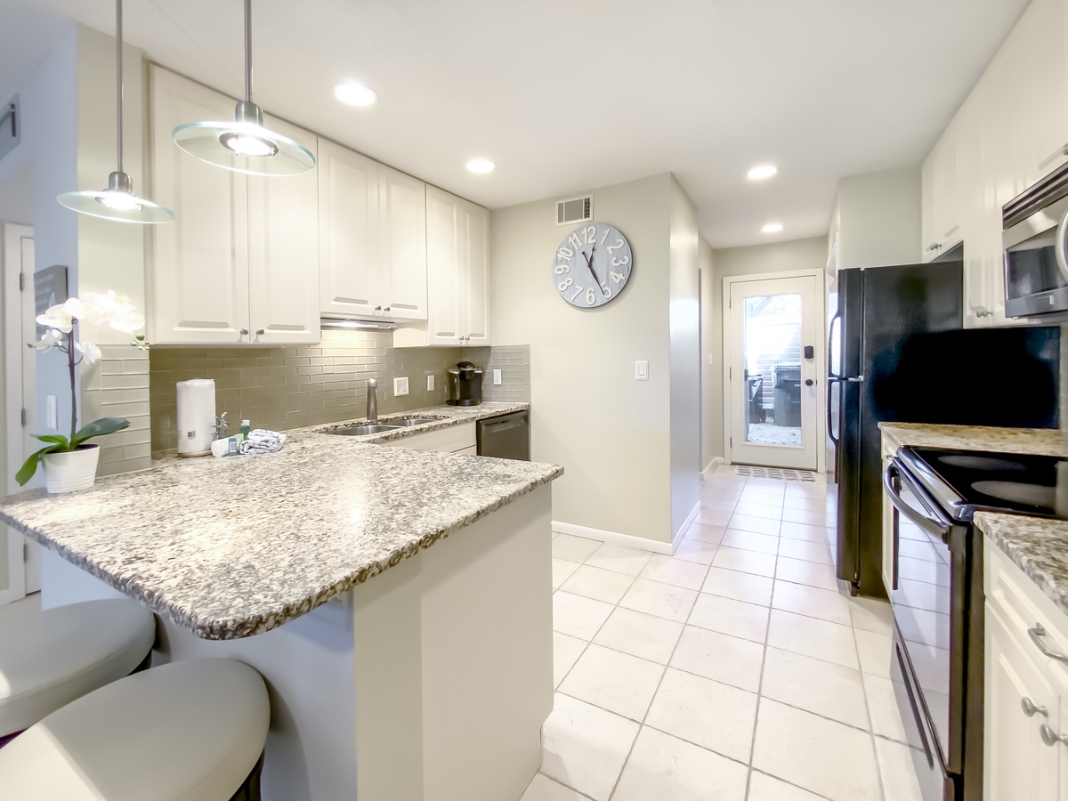 Just beyond bar seating for two we find the well appointed kitchen, with leathered granite counters wrapping around a full suite of appliances. A nearby washer and dryer offers all the conveniences of home, and a half bath rounds out the main floor’s amenities.
