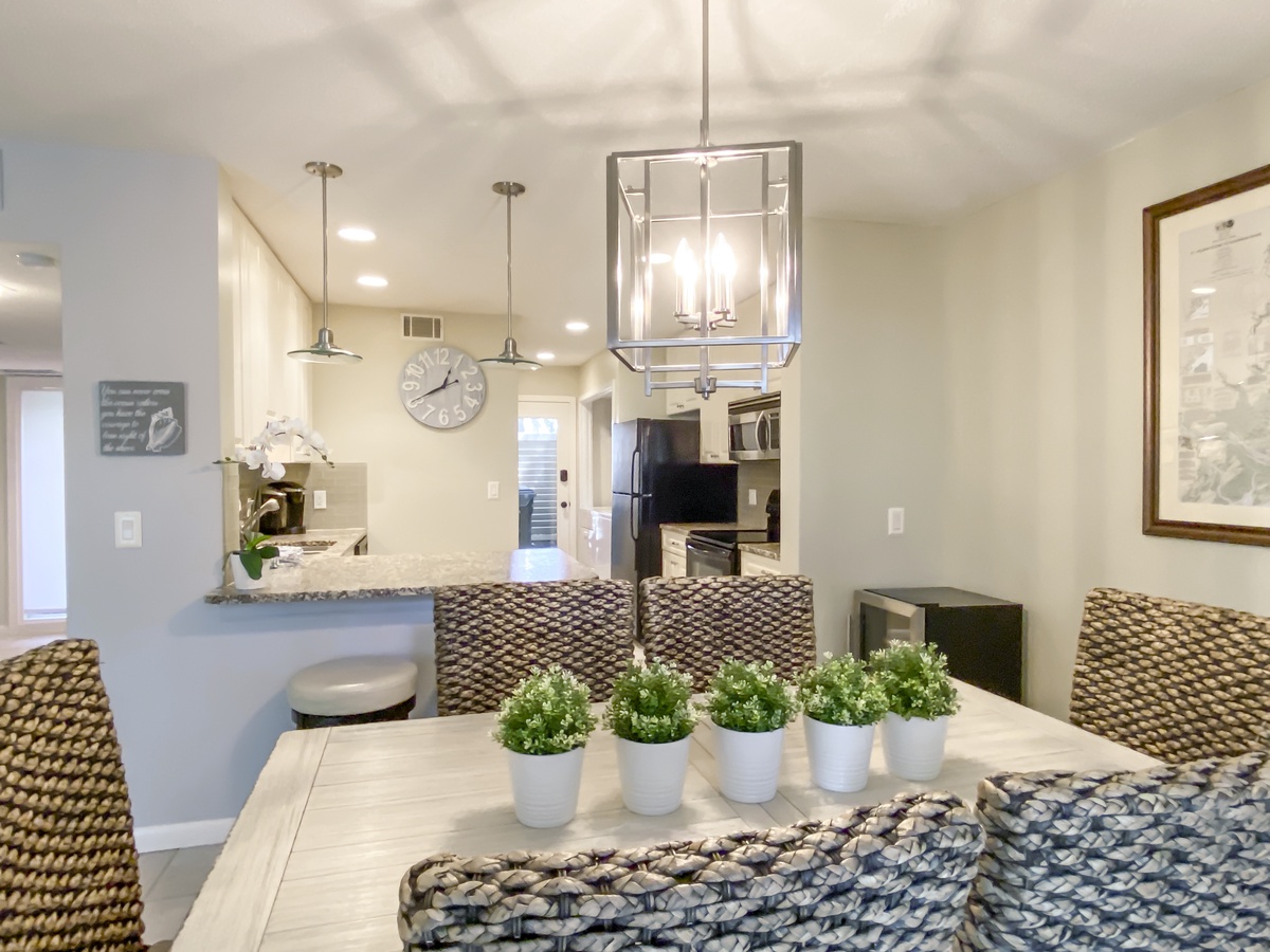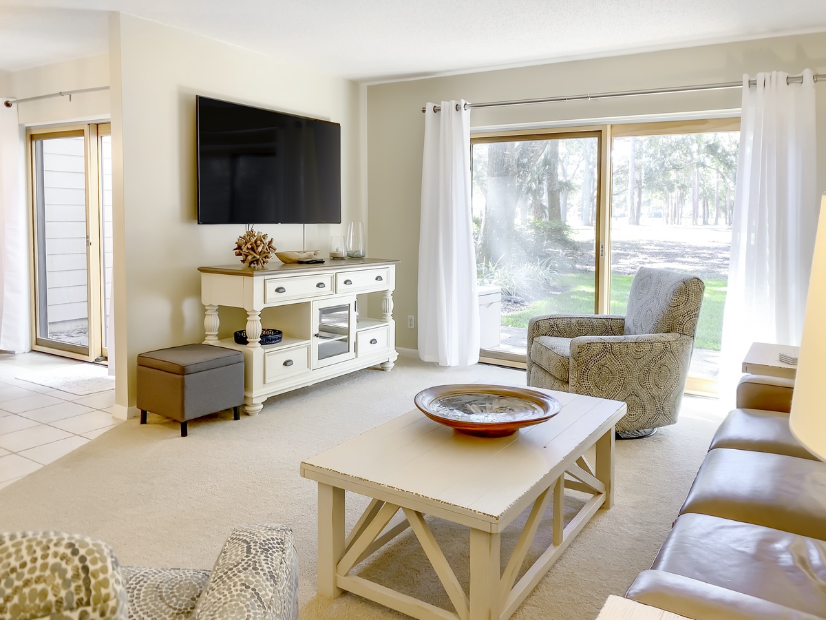 The delightfully airy open floor plan breezes you in as you enter, guiding you to the lushly spacious living room. Here, a leather sleeper sofa and dual armchairs face a large flat-screen TV in a space that exudes comfort. Nearby, the elegant dining room offers seating for six expandable to eight around a farmhouse-style table while a convenient wine cooler keeps the conversation flowing. Sliders from both spaces open up to a wide patio with al fresco dining for four beneath a patio umbrella, with rolling views of the 1st, 9th and 10th holes of Harbour Town Golf Links beyond.