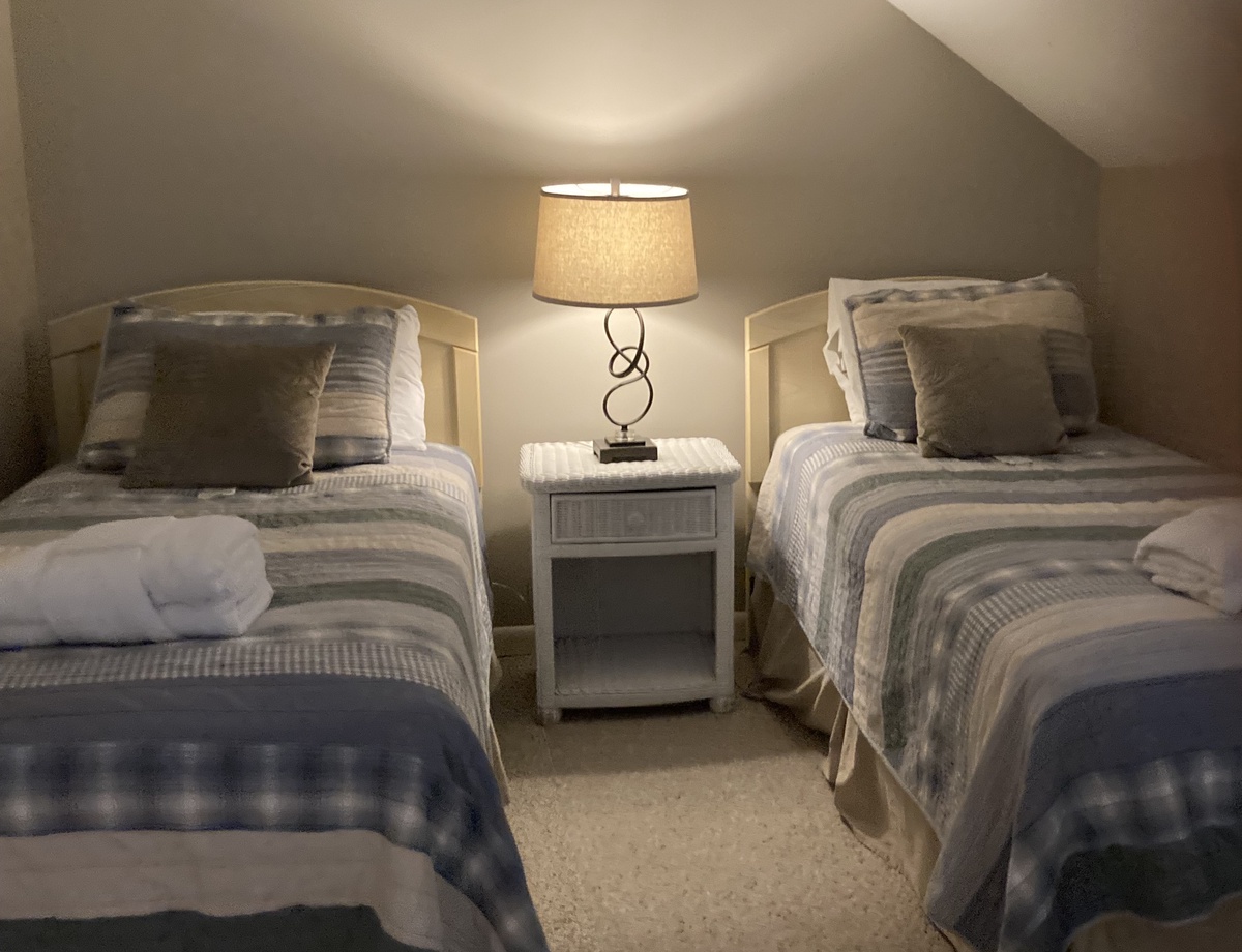 The third level of the townhome holds two additional bedrooms that share a bathroom with tub/shower combination. One room features two double beds, a TV and lovely golf views. The other bedroom has two twin beds and a flat screen TV.